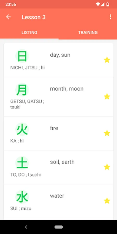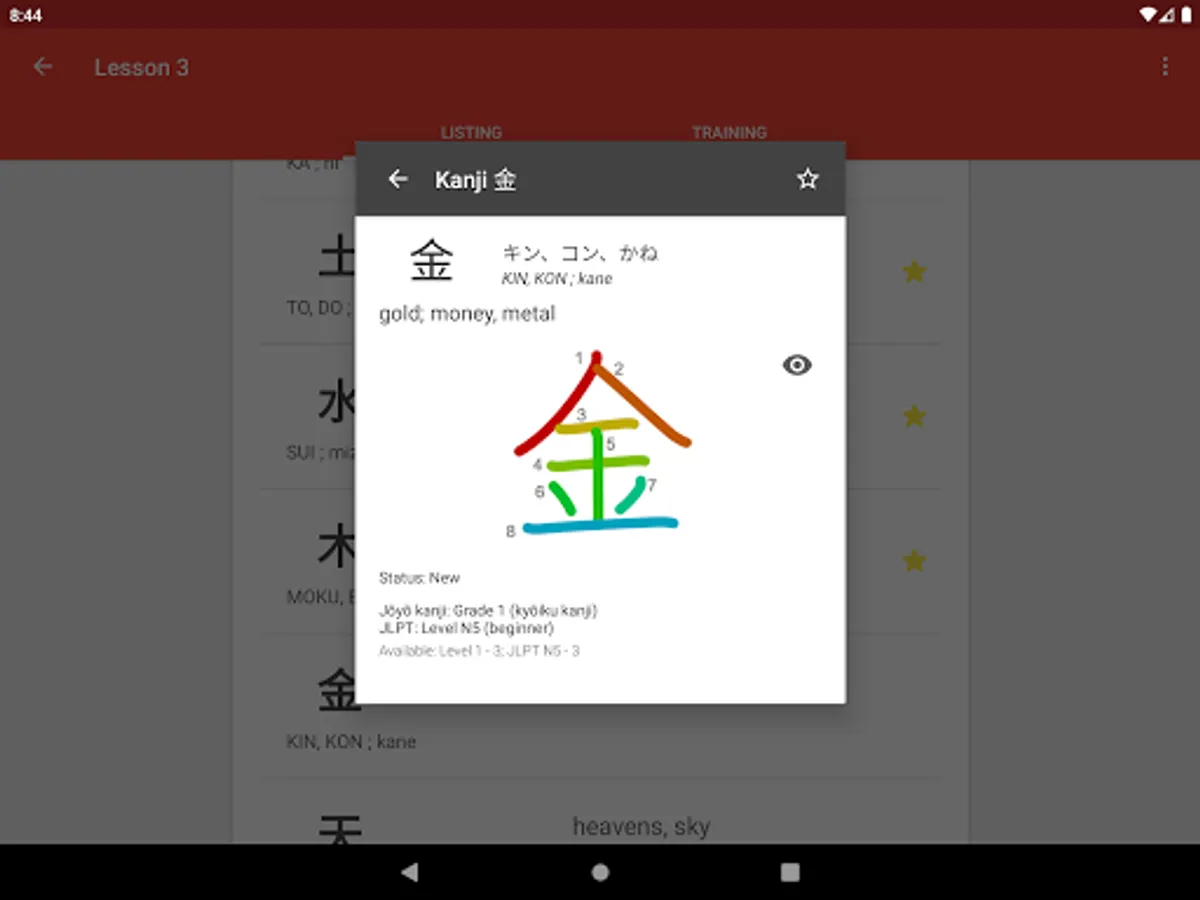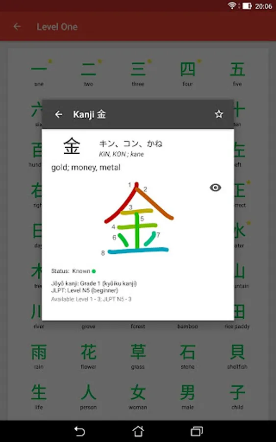The application is designed to learn Japanese characters, and first of all, kanj. Kanji are the adopted Chinese characters used in the modern Japanese writing system. It will help you to memorize characters and their basic meanings and readings.