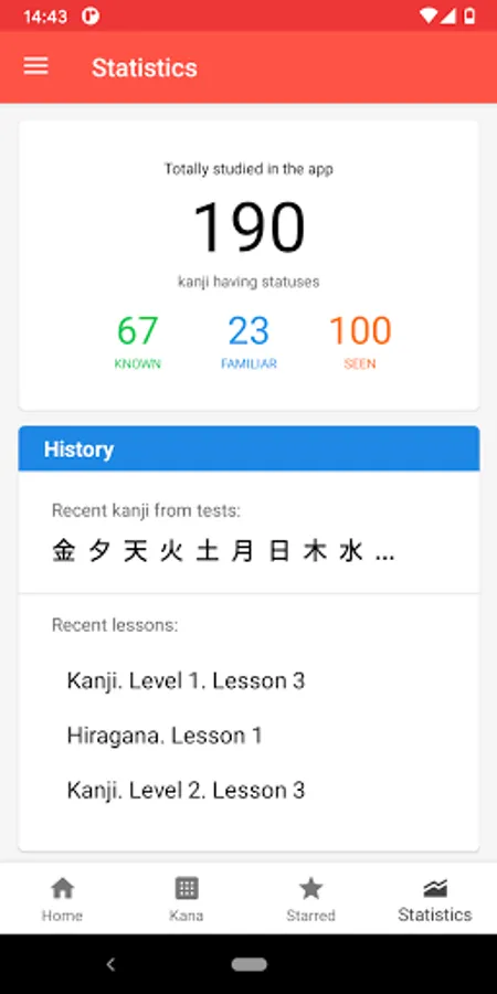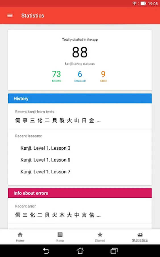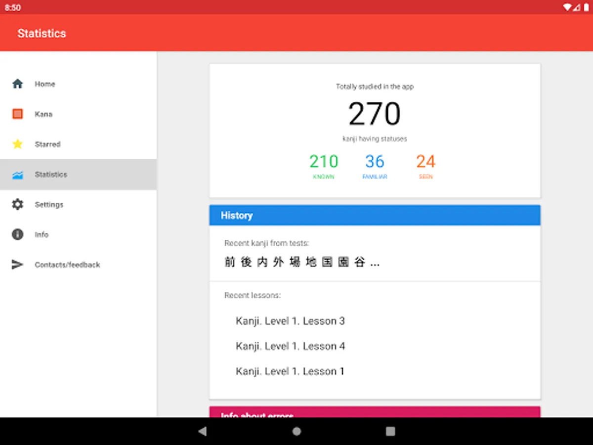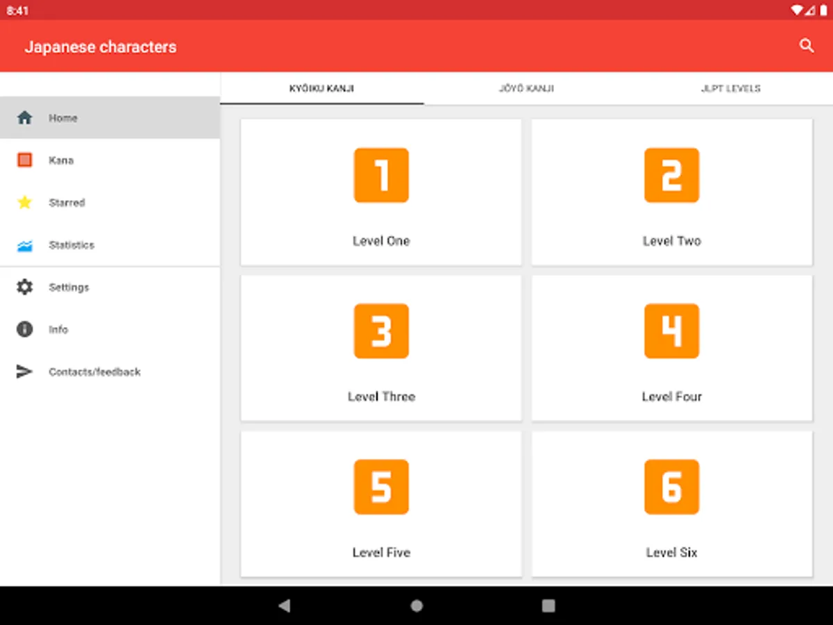 The application contains Kyoku kanji list, which includes 1006 characters. There is also Kana section that allow to study and practice Japanese syllabaries, Hiragana and Katakana, which can be very useful for beginners.