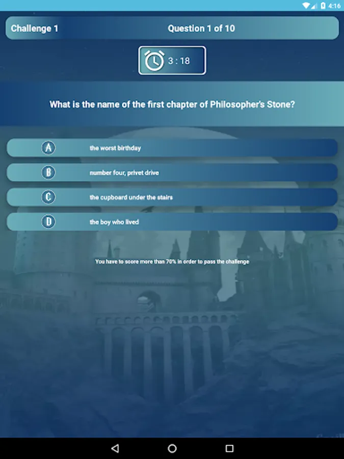 ★Unofficial Application★ - Though this game somehow based on harry potter series but it is an unofficial quiz game app which is not affiliated by the harry potter books and movies in any means.