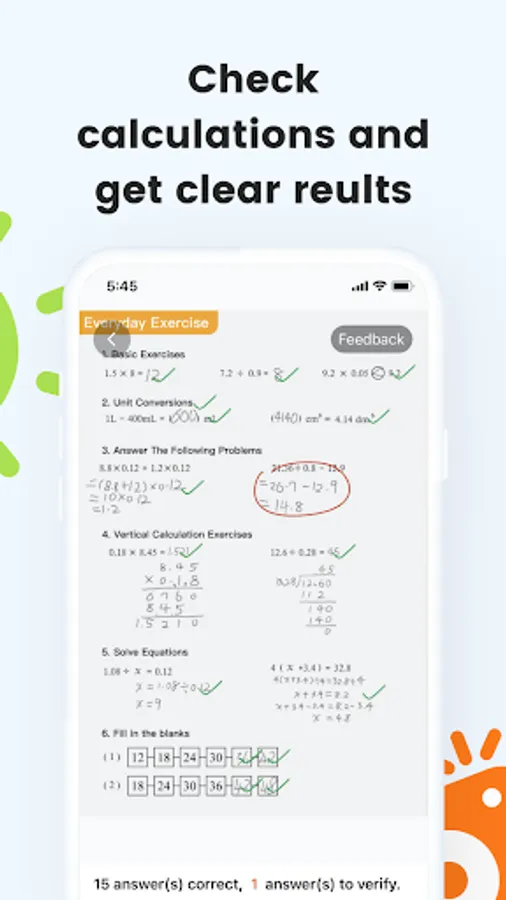 After taking pictures, CheckMath will instantly check the answers to various question types, including addition, subtraction, multiplication, and division, as well as vertical calculation, pattern identification, equation, unit conversion, and math expressions with brackets.