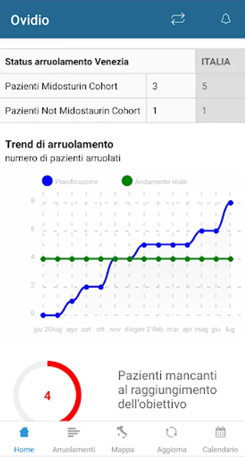 Application that allows the management of information relating to the progress of the clinical study. In particular, the application allows you to constantly view the authorization status of the centers involved in the context of a clinical study and the overall trend in terms of patient enrollment.