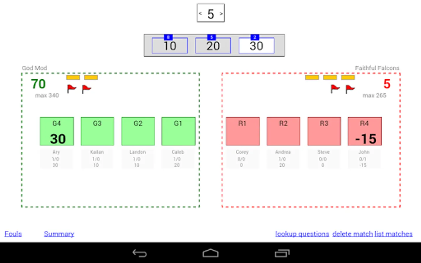 To keep score, you just click the point value of the question and then click the box for the quizzer that buzzed in. If they get it wrong, you just click on the quizzer again to change the points from positive to negative. The score app is easy to use since it is displayed just like the quizzers are seated. There is however a "summary view" that will display the score like a traditional score sheet.