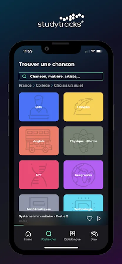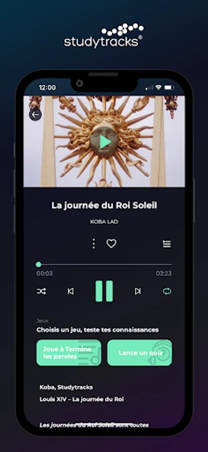 Studytracks is an application for learning in song. You listen to a song and remember the lyrics for years. Unexpectedly, the lyrics stick in your mind and you remember them instantly. Studytracks is a proven teaching method. It was developed with the help of world specialists in cognitive sciences.