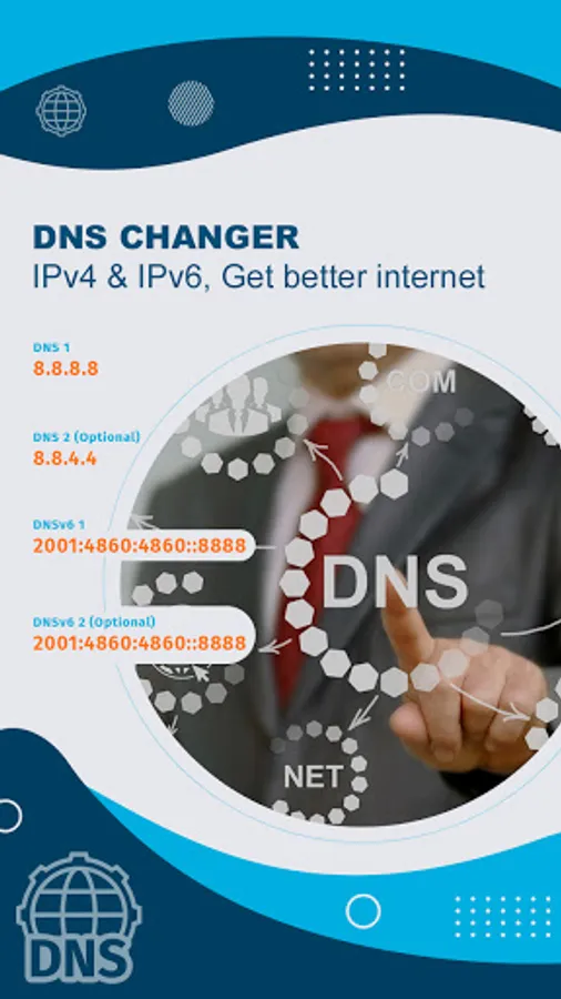 DNS Changer - IPv4 & IPv6, Optimize Internet Speed app changed DNS server easily and simply. DNS Changer is working without root and you can use it for both WiFi and Mobile Network Data Connection (3G/4G).