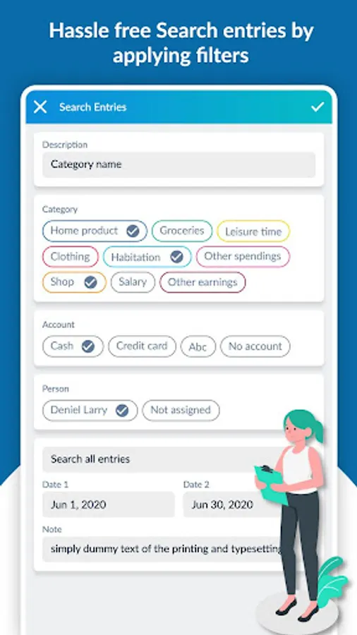 - Search transaction by date, description, category, account, person and note.