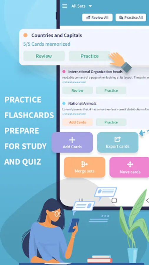 Improve your studies by memorizing with flashcards, easily create and modify study sets, and share them with friends.