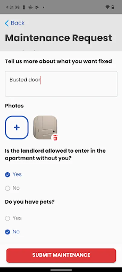 - Submit maintenance requests with photos to your landlord to get the issue resolved ASAP