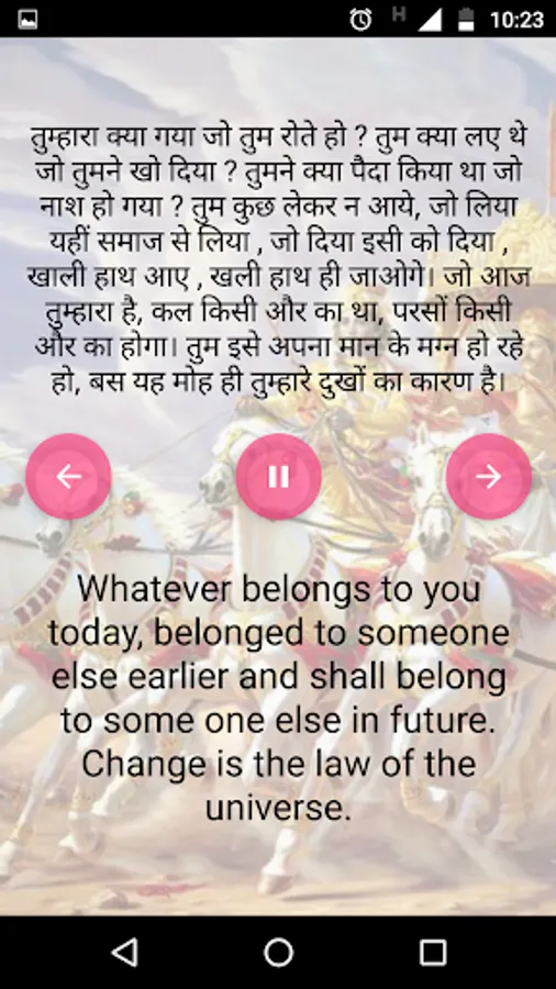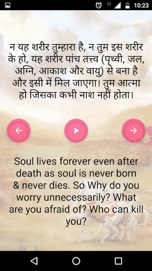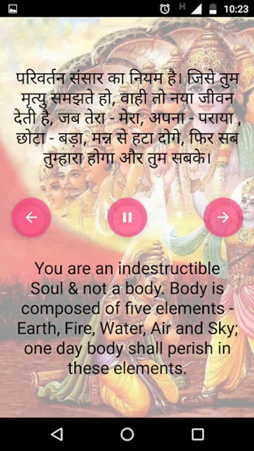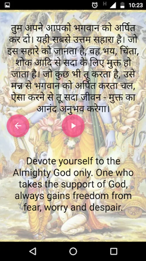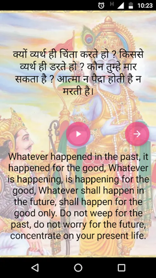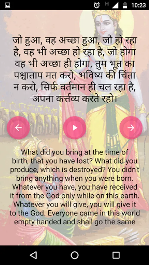 The Bhagavad Gita is the essence of the Vedas and Upanishads. It is a universal scripture applicable to people of all temperaments, for all times. It is a book with sublime thoughts and practical instructions on Yoga, Devotion, Vedanta and Action. Two of the most significant passages of the Gita are Lord Krishna's instructions to Arjuna on the nature of correct actions and the role of God in protecting his devotees.