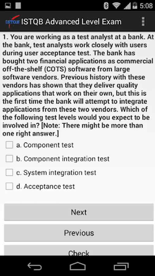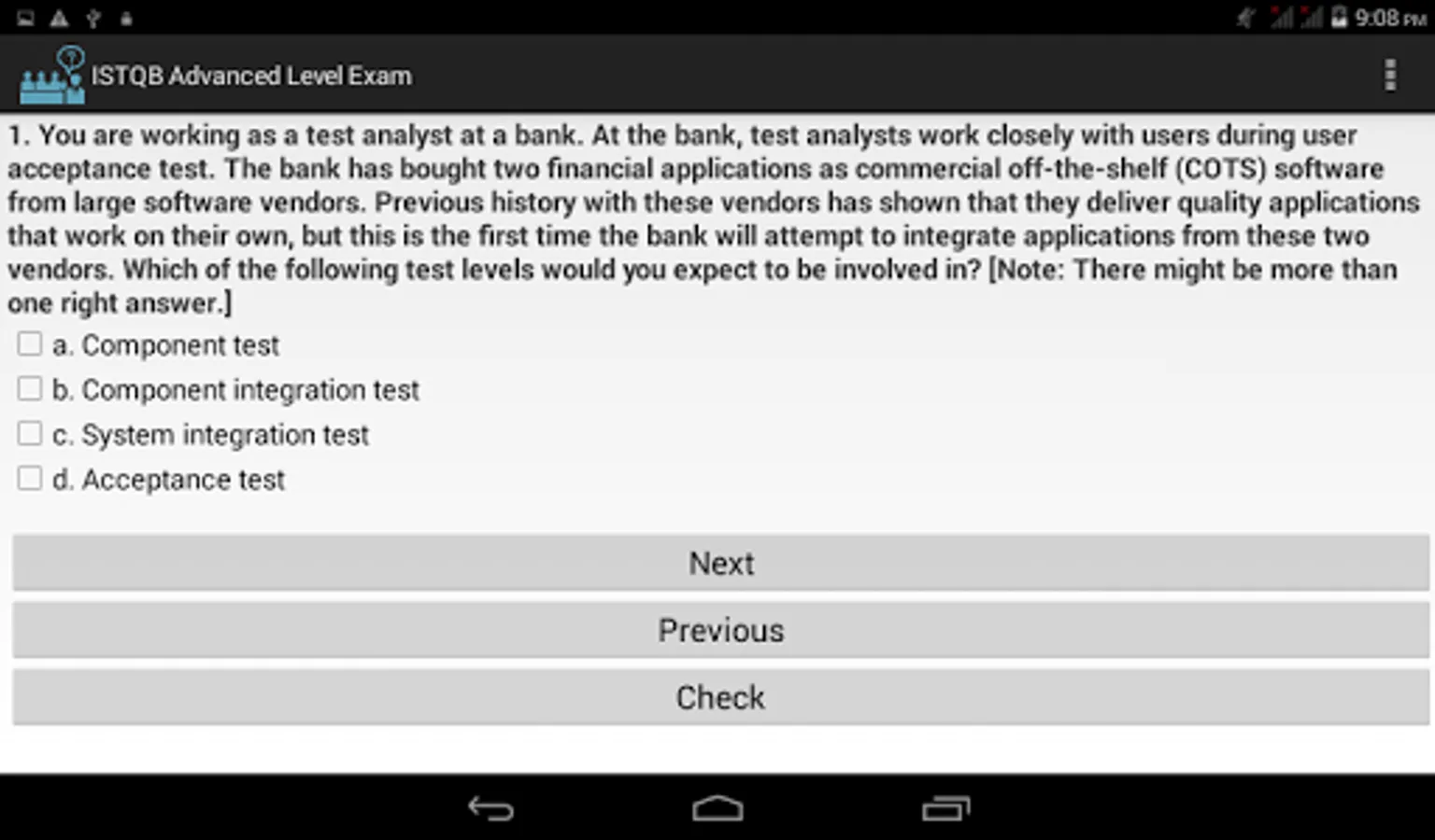 This application helps you to prepare for advanced level software testing certification exam. This app contains 81 sample questons which you can attempt and analyze your answers. You can track your result and performance easily. This app works offline so there is no need of an internet connection, so you can prepare for the exam on the go, while traveling, in spare time and so on.