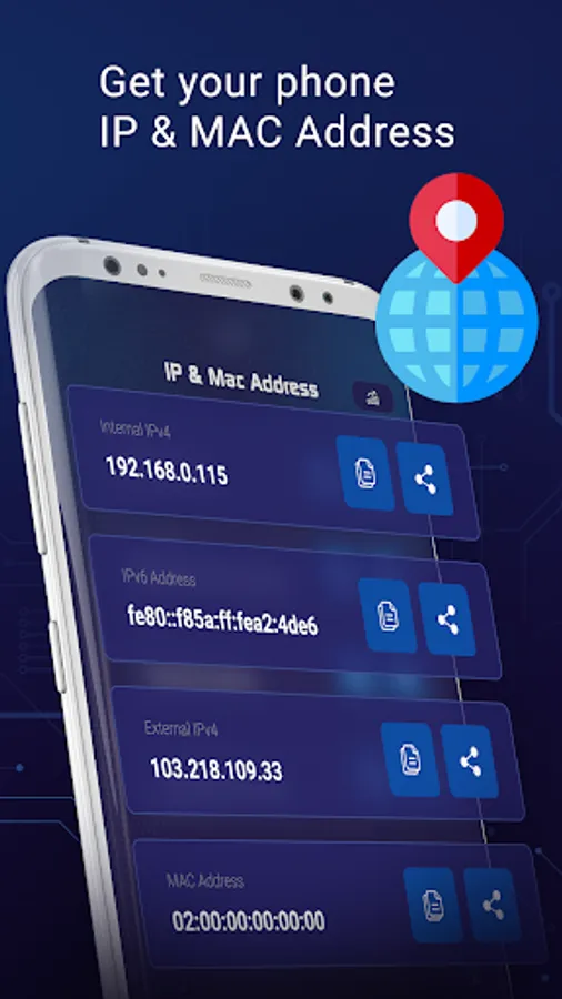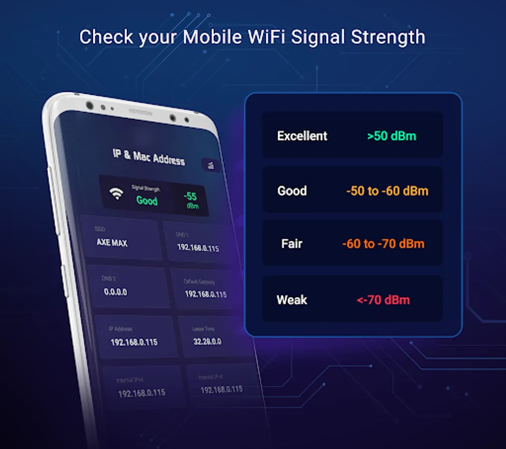 The app provides you information of IP Address and MAC address of your device and WiFi signal strength of your WiFi connection. You get the following information with the help of this application :