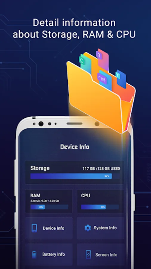 - View details of your phone like system hardware (MAC Address, Model name, OS Version, API Version, RAM, CPU)