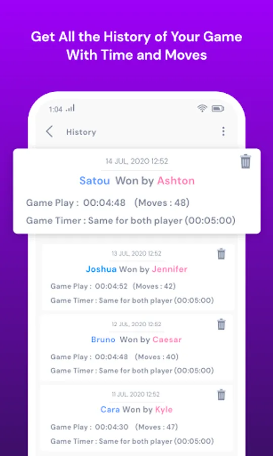 -- Get history details of the winner statistics like, total moves, total time used, date etc.,