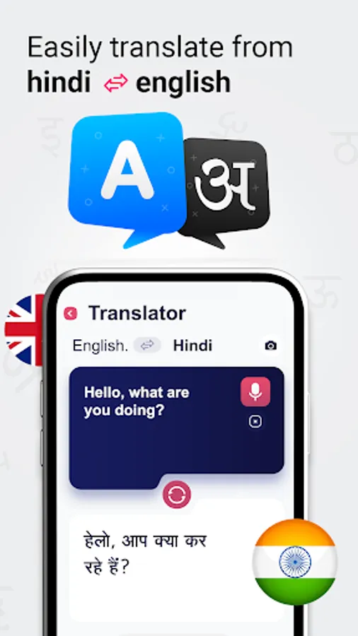 This Hindi to English translator helps you to type or write in English and translate to Hindi language and vice versa. Also translate using voice speech to text. This will help you easily to translate voice to text and translate it to Hindi in speech. Not one text and voice translation but you can also click a photo to translate the text in the photo using this app.