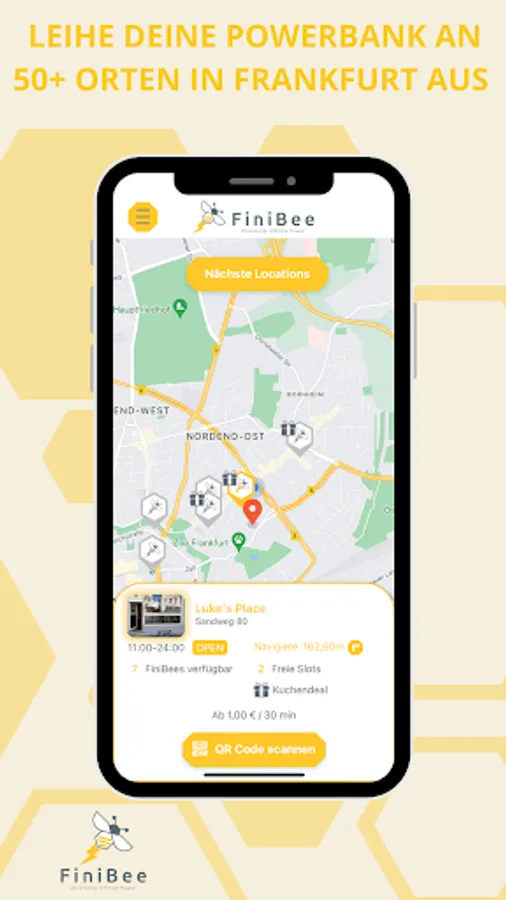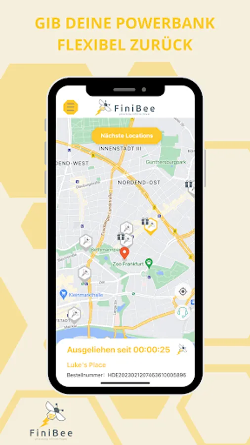 Battery empty? Download the app, find a power bank near you and get unlimited power - anywhere and anytime. We are Frankfurt's first power bank sharing startup and bring you energy to the streets. Whenever you need power for your smartphone, iPad or headphones, the next FiniBee is not far - flexible, inexpensive and without cable clutter - because the right cable is included.