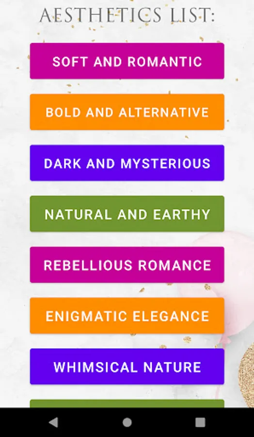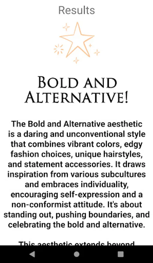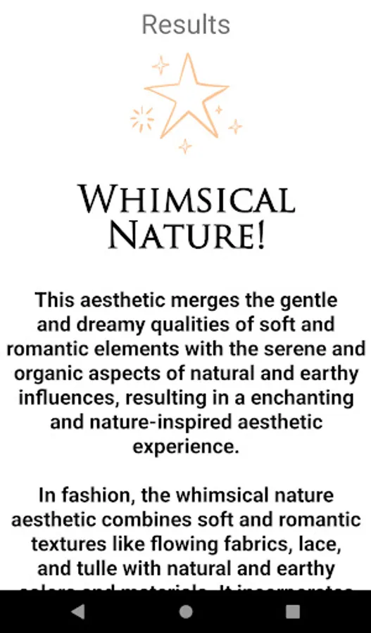 This app covers 15 different aesthetic styles, immerse yourself in a captivating quiz of carefully crafted questions designed to uncover your aesthetic inclinations and explore various aspects of your personality, interests, and preferences.