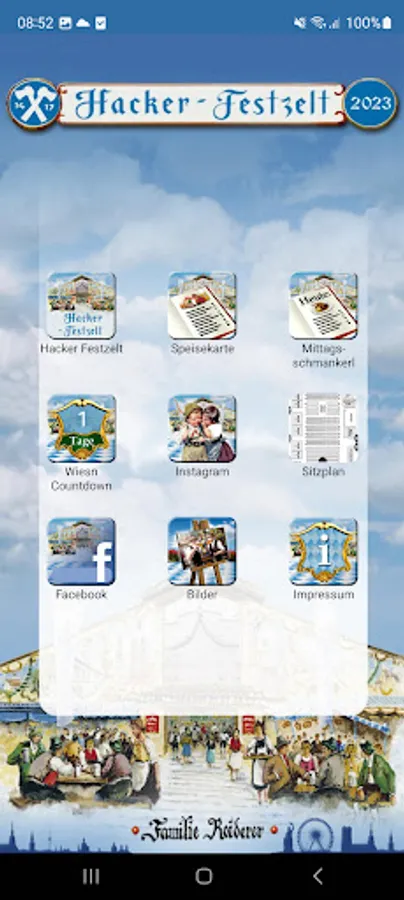 The "Heaven of Bavaria" - the Hacker festival tent shines in new splendor this year! It offers space for 6830 people, the beer garden and the balcony for another 2520 people. The new tent is framed by a 2,000 square meter painting with scenes from Munich city life such as a picnic on the Isar or the surfers' wave on the Eisbach. The construction time is approx. 9 weeks, the dismantling time approx. 4 weeks. Now you can use your smartphone to call up information about the Hacker Festzelt from anywhere.