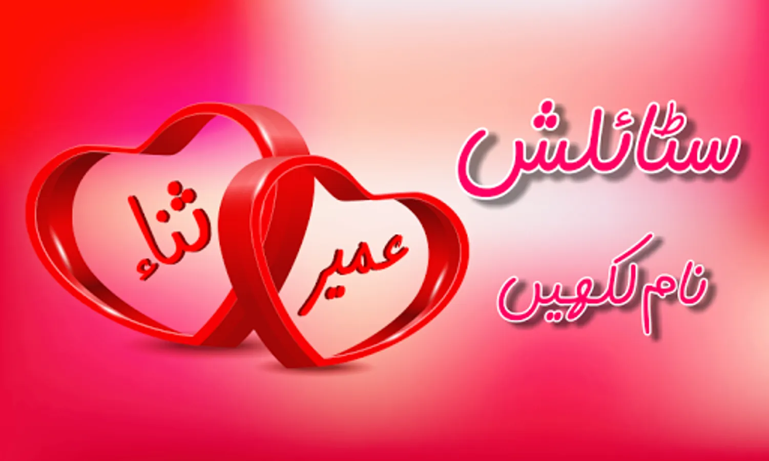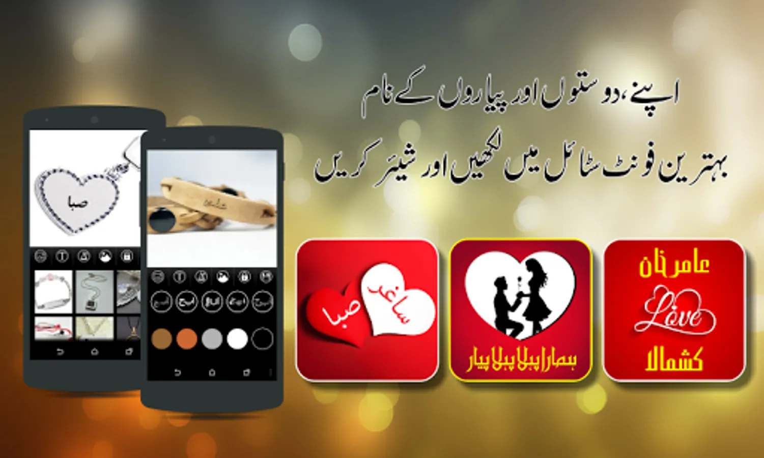 Write your text on photo and beautiful wallpapers using Urdu and English keyboard. Write your name, friends name and your lover name on keychain, locket, heart and bracelets and share with friends using different social media.
