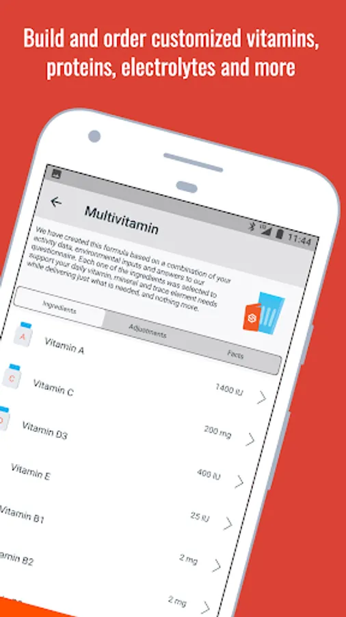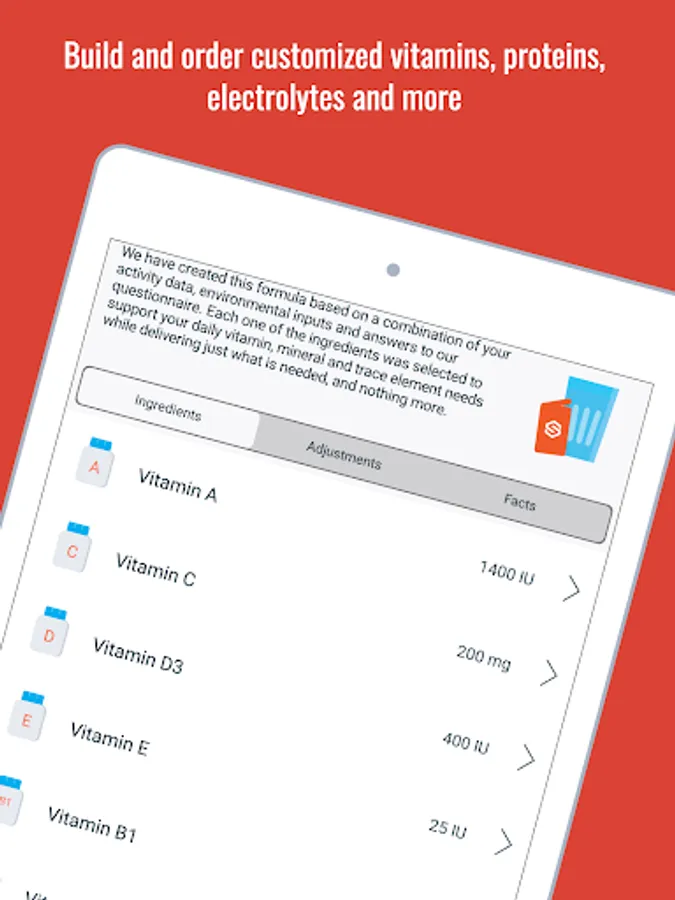 Create your own customized vitamins, proteins and electrolytes using our patent-pending app. It seamlessly connects with our own range of wearable and fitness devices or it syncs up with many others such as FitBit or Jawbone. Combine your motion, activity and environmental data with our science-validated research to create personalized nutritional products as unique as you are.