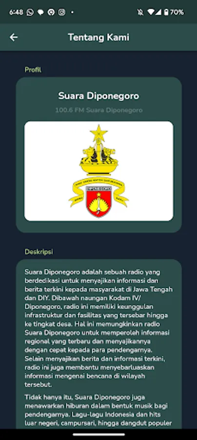 Radio Suara Diponegoro is a news and information radio application that offers a unique radio listening experience. This radio is under the auspices of Kodam IV/Diponegoro and is equipped with infrastructure and facilities that extend down to the village level in Central Java and DIY. This advantage allows Radio Suara Diponegoro to provide the latest information on regional situations and conditions, as well as provide and disseminate information on disasters.