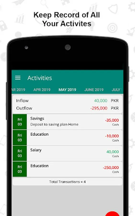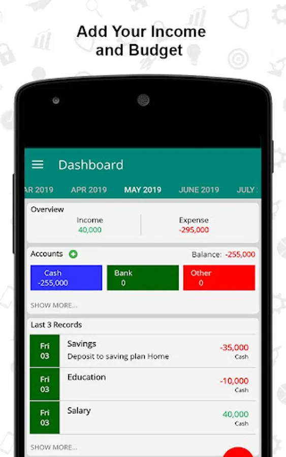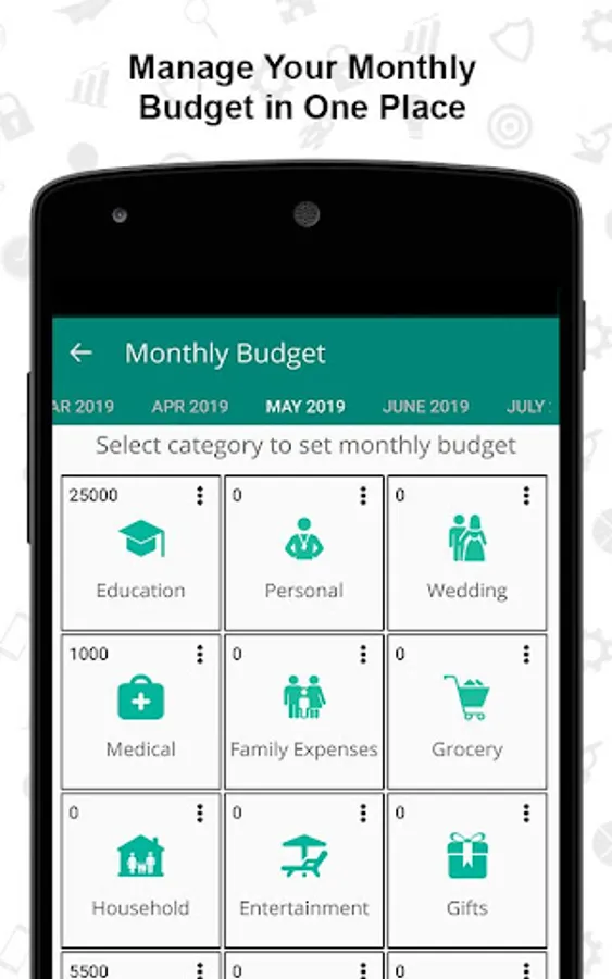 Budget- It works to set your goal of adding an amount that you have planned to be saved for some future purpose, for example, constructing a house or for education. Simply select your category, add your set budget and then it will show the added and left amount also in percentages.