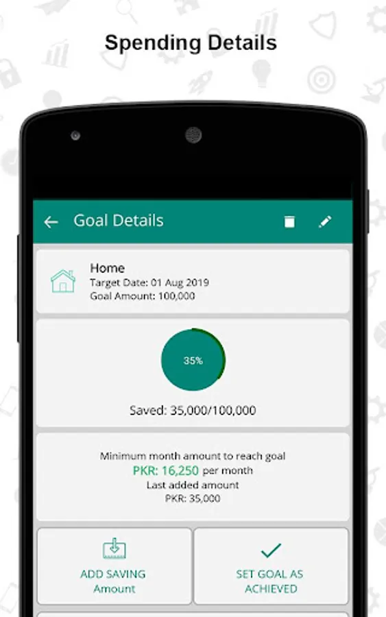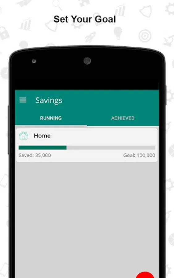Savings- Select your category for what you are saving for, then choose the target date. After setting a goal, it's set date divides the savings amount on the period of months to show how much you should save monthly.