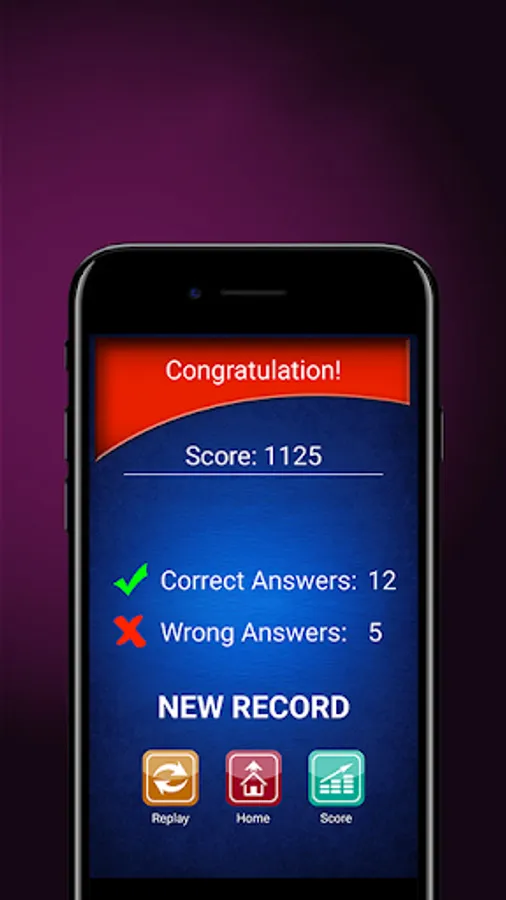 Here 3 icons facilitate user to replay the quiz, go back to home screen or explore the total obtained scores.