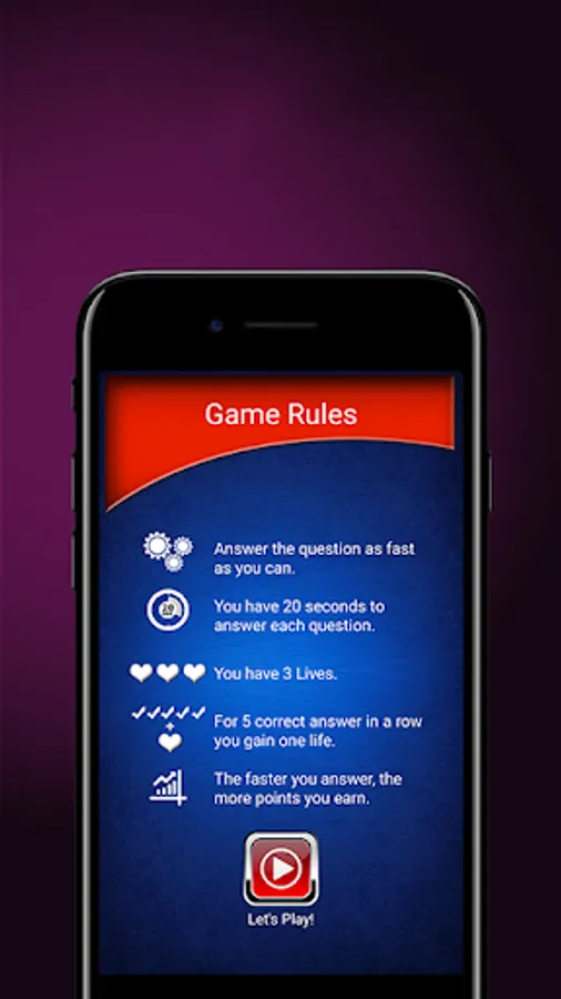 After selecting each category, app introduces the rules of game. These are 5 rules about the timing and proficiency to answer. To start, tap on play button then attempt the given questions of quiz in every category, then a result sheet will be displayed which contains: