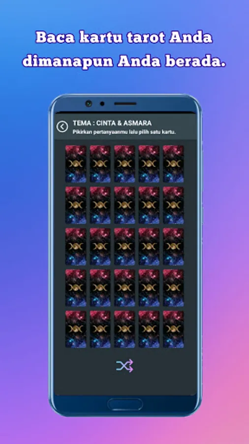 Use this application to answer your questions. This app uses all 78 Tarot cards including 22 Arkana Majors and 56 Arkana Minors, based on the Rider-Waite deck. There is an option to shuffle the cards if you wish.