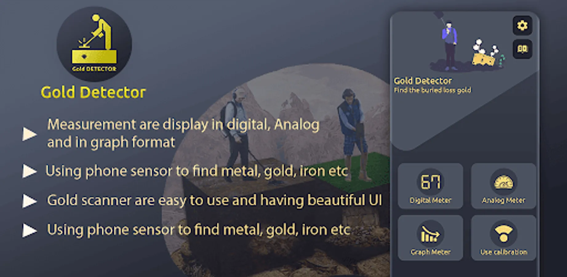 Gold detector is a handy, magnetic sensor-based app that helps you detect precious metals and minerals right on your Android phone! By using the frequency data generated by the magnetic sensor in your device, Gold Detector can identify the presence of metals like gold, silver, and platinum with ease! This app is perfect for miners, prospectors, and anyone else who wants to find valuable materials and metals!
