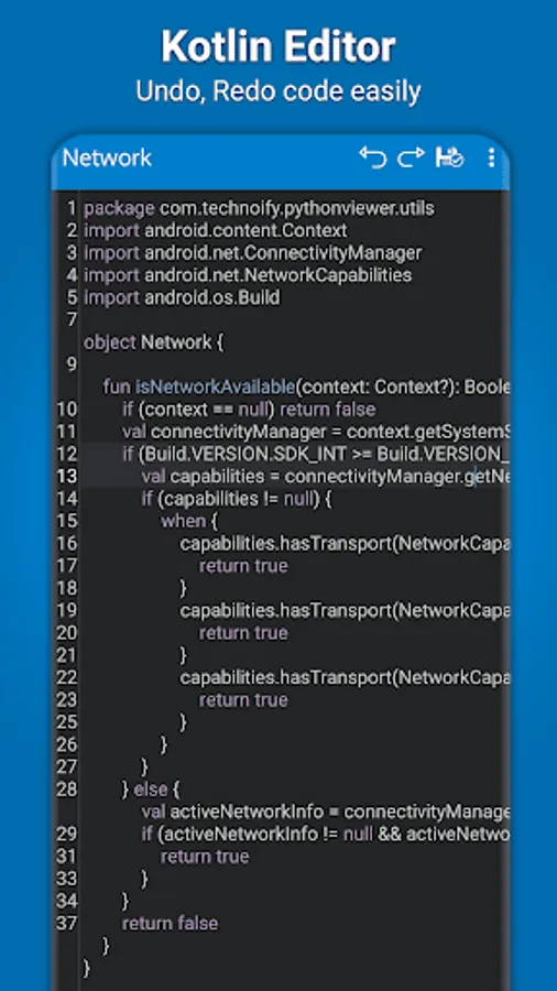 Kotlin Viewer is a simple, free editor for the Kotlin programming language through which you will be able to read with syntax highlighting, which help you to read code easily. Kotlin editor has the ability to undo and redo code while editing code and can also change editor font size easily.