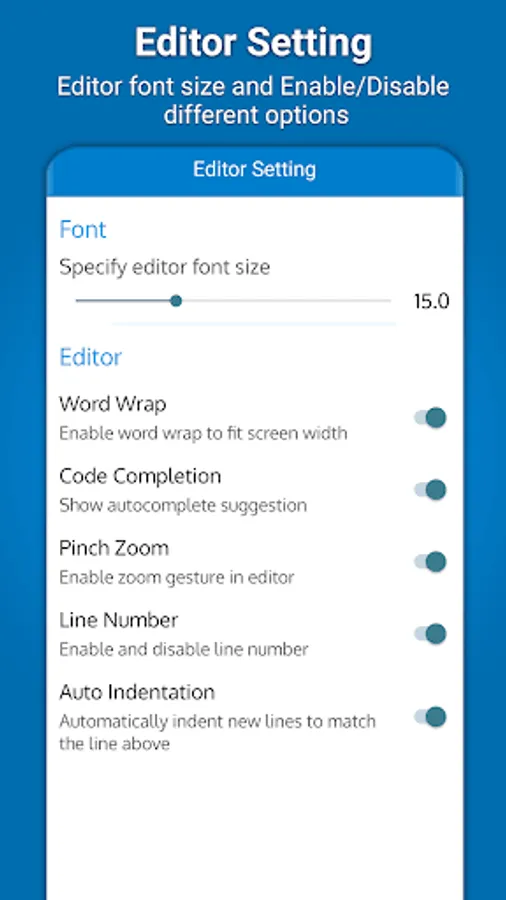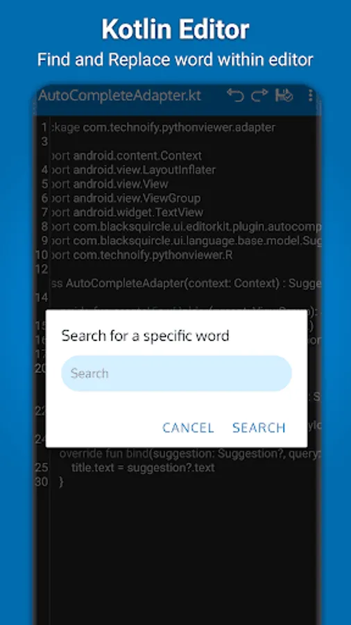 Kotlin Editor has different features like auto indentation, pinch to zoom, auto code completion and many more which you can enable and disable from setting easily. Kotlin file reader also support Find and Replace operation through which you can easily find and replace any word easily.