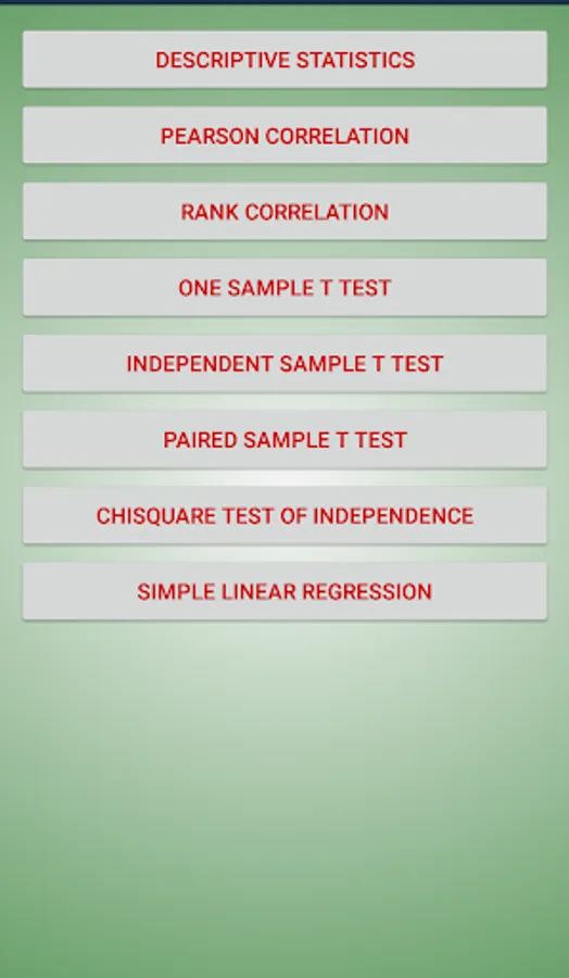 Functions include Descriptive statistics, Pearson correlation, Rank correlation, One sample t test, Independent samples t test, Paired samples t test, Chi square test of independence and Simple linear regression