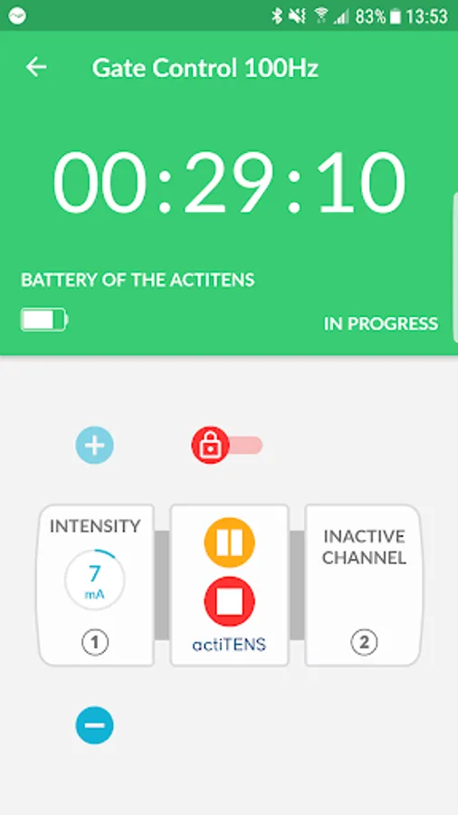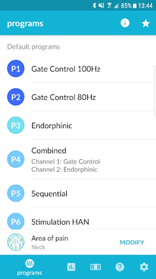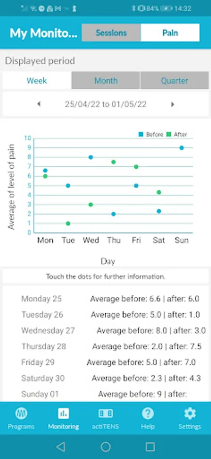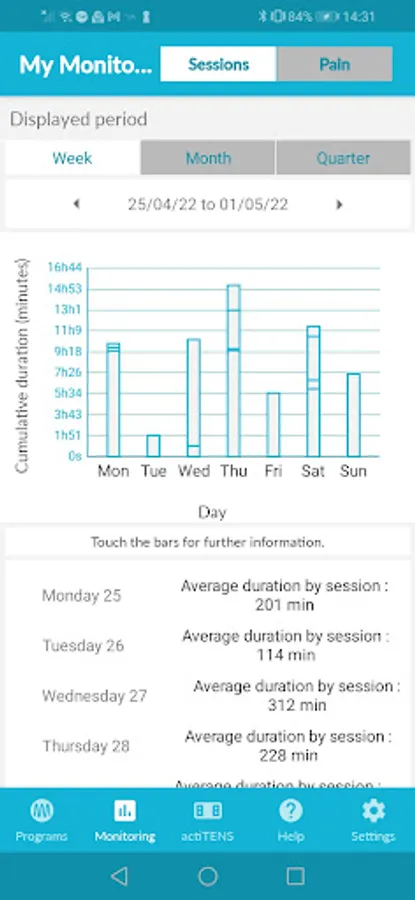 The actiTENS application provides various stimulation programs and tracks details related to your stimulation sessions which can be consulted in a dedicated monitoring tab (duration, type, pain level recorded before and after the session).