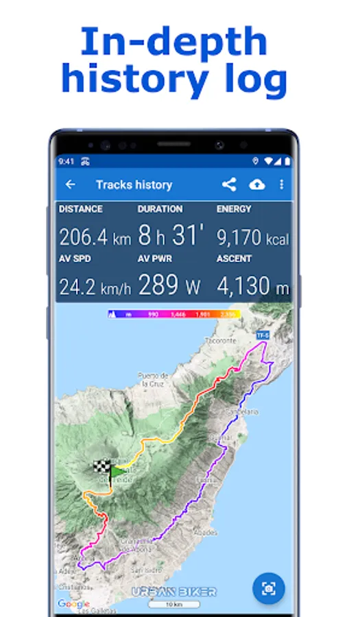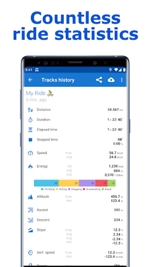 β’ Cockpit πΊ β shows accurate distance, duration, altitude, ascent, descent, power, climb power, energy, efficacy, heart rate, step count, cadence, gear ratio, kinetic energy, vertical speed, acceleration, pace, pressure, temperature, odometerβ¦ more than 75 statistics in total!