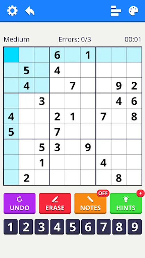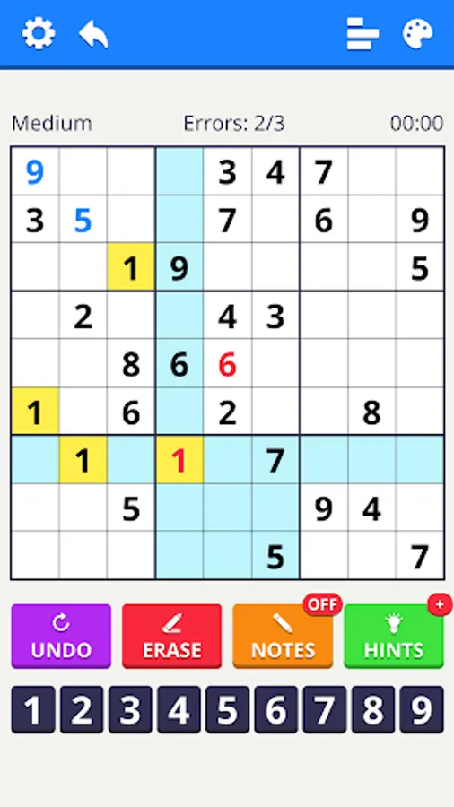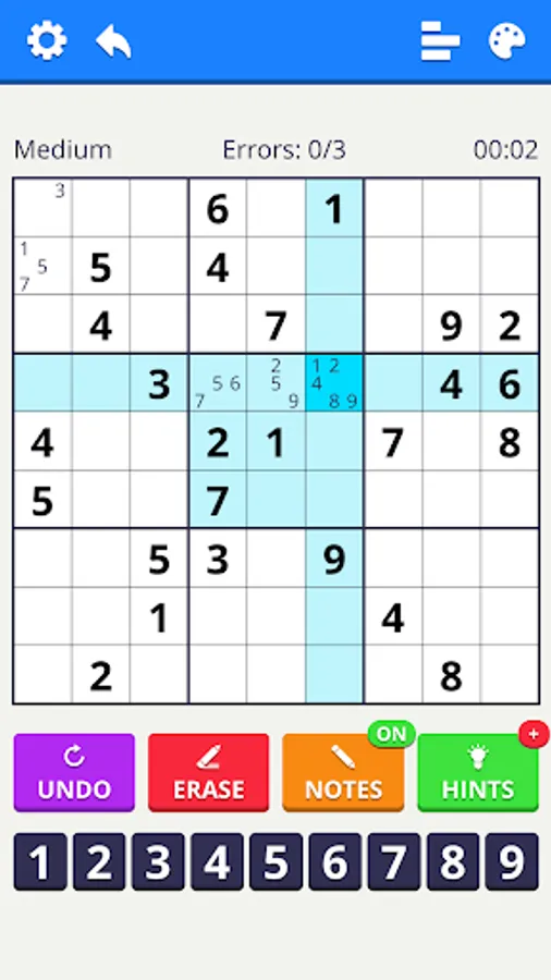 ✓ Turn on Notes ✍ to make notes as on paper. Each time you fill in a cell, notes are automatically updated!