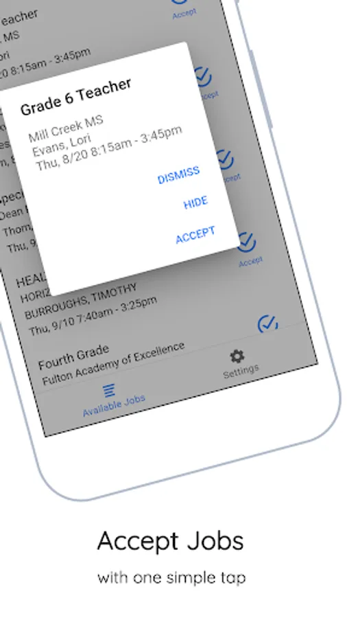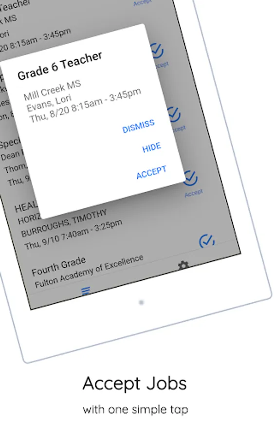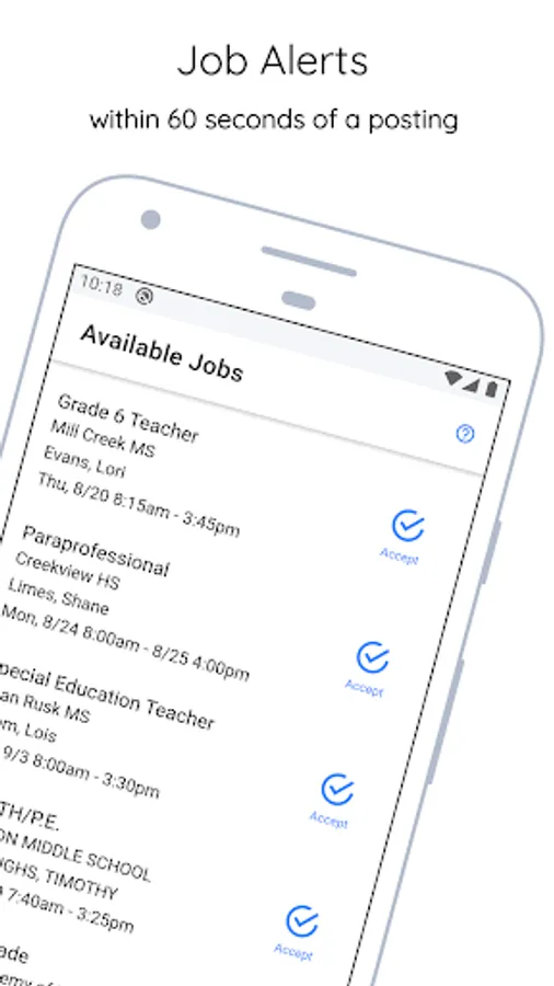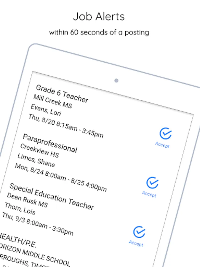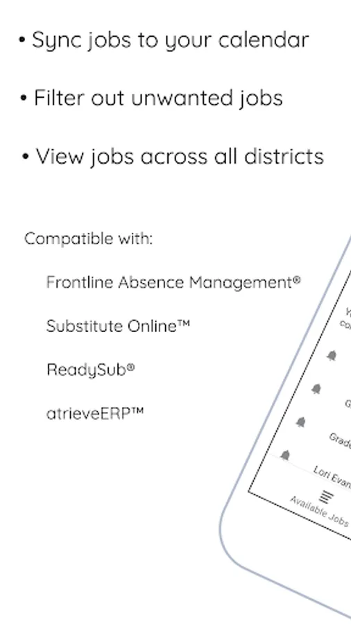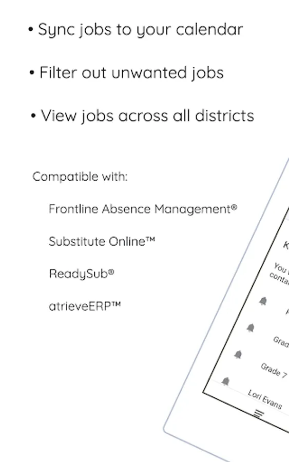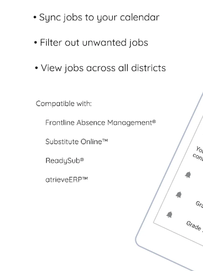Quickly accept the jobs you want with fast and personalized job alerts, job booking, and calendar syncing for substitute teachers using Frontline Education Absence Management (formerly Aesop), ReadySub, Substitute Online, or atrieveERP!