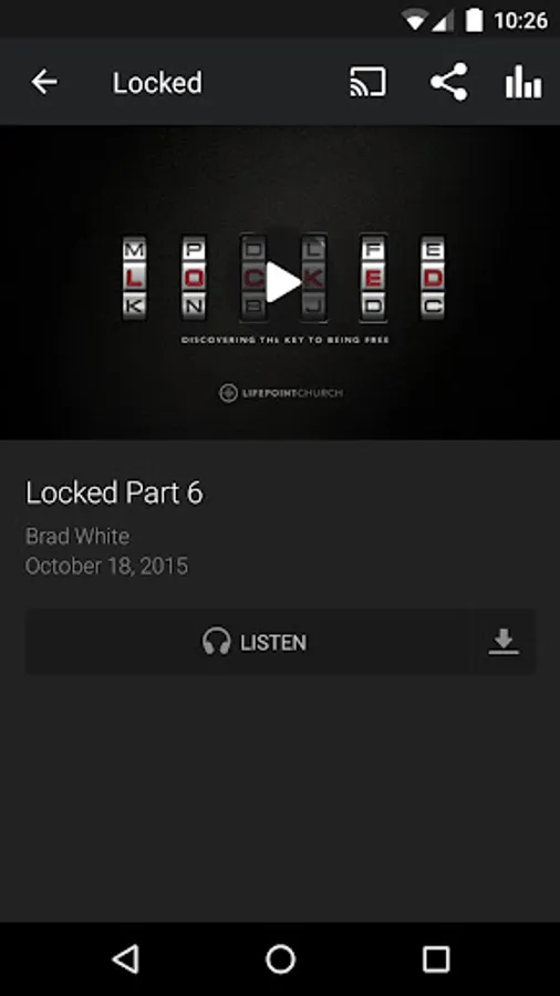 The LifePoint app features content from Pastor Brad White as well as opportunities to stay connected with the latest news from LifePoint. Share content with your friends via Twitter, Facebook or email.