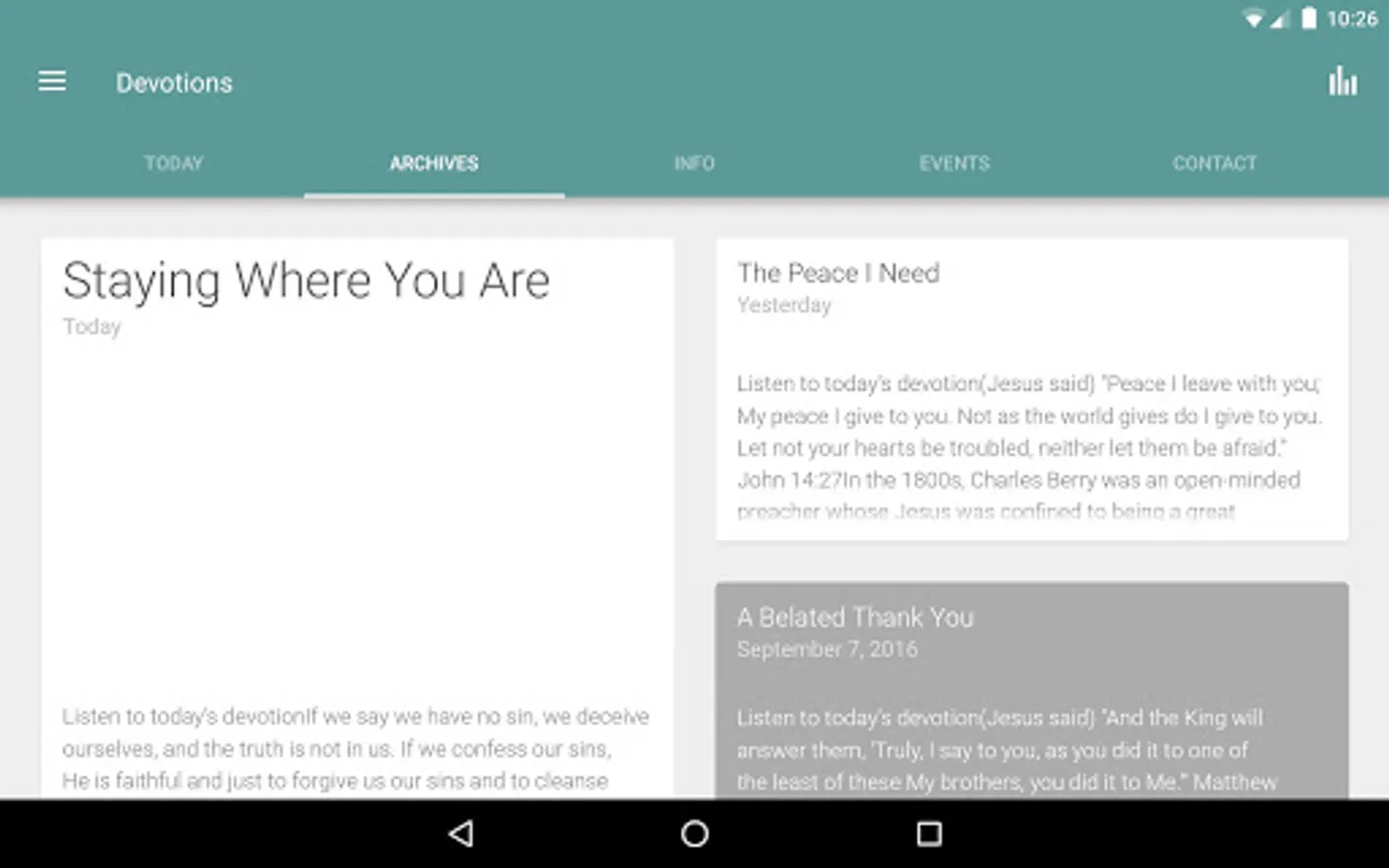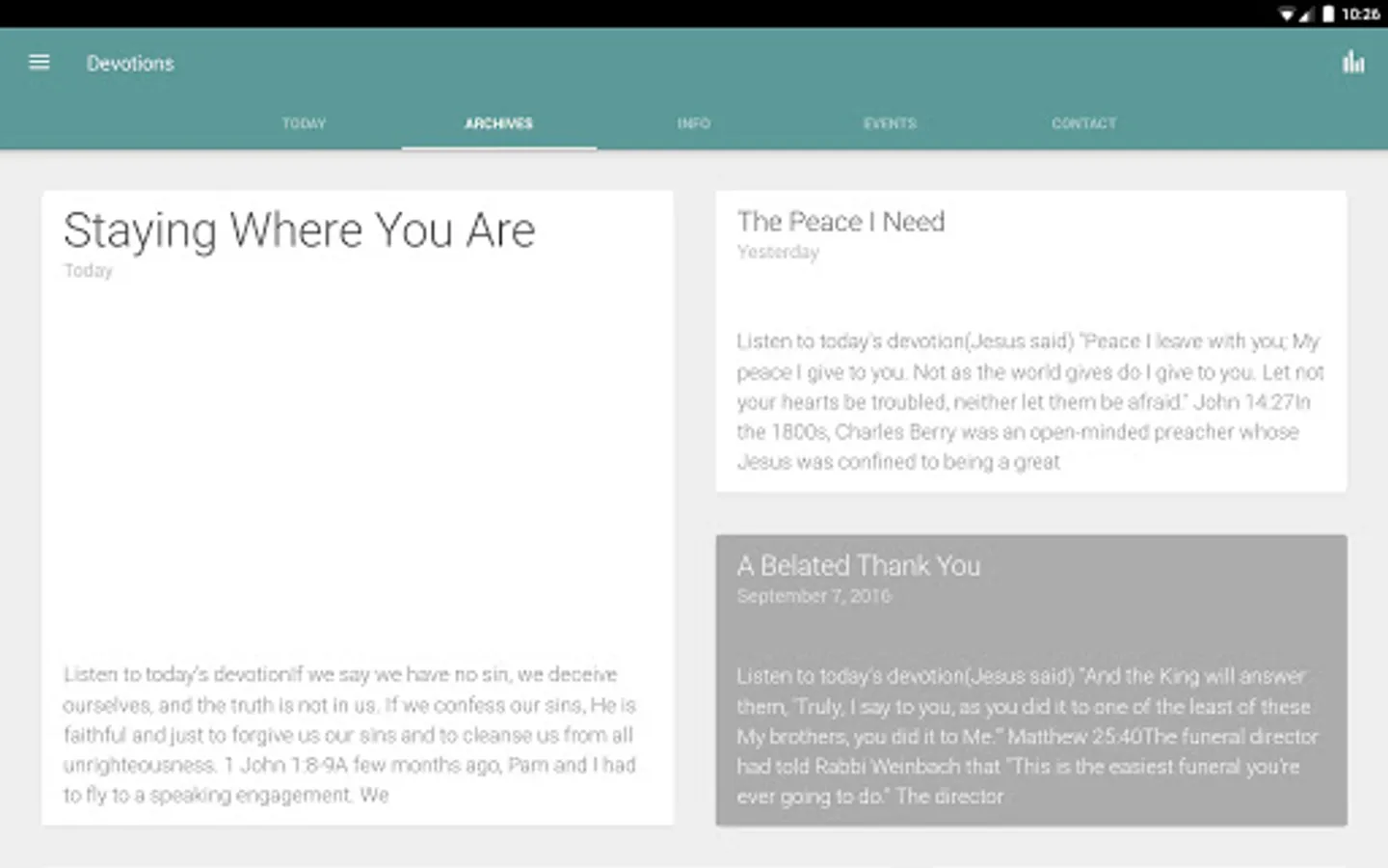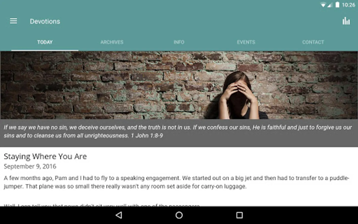 Also be on the lookout for themed devotions delivered through this app, particularly during the Lenten and Advent seasons. After you’ve downloaded and enjoyed the messages, you can share them with your friends via Twitter, Facebook, or email.