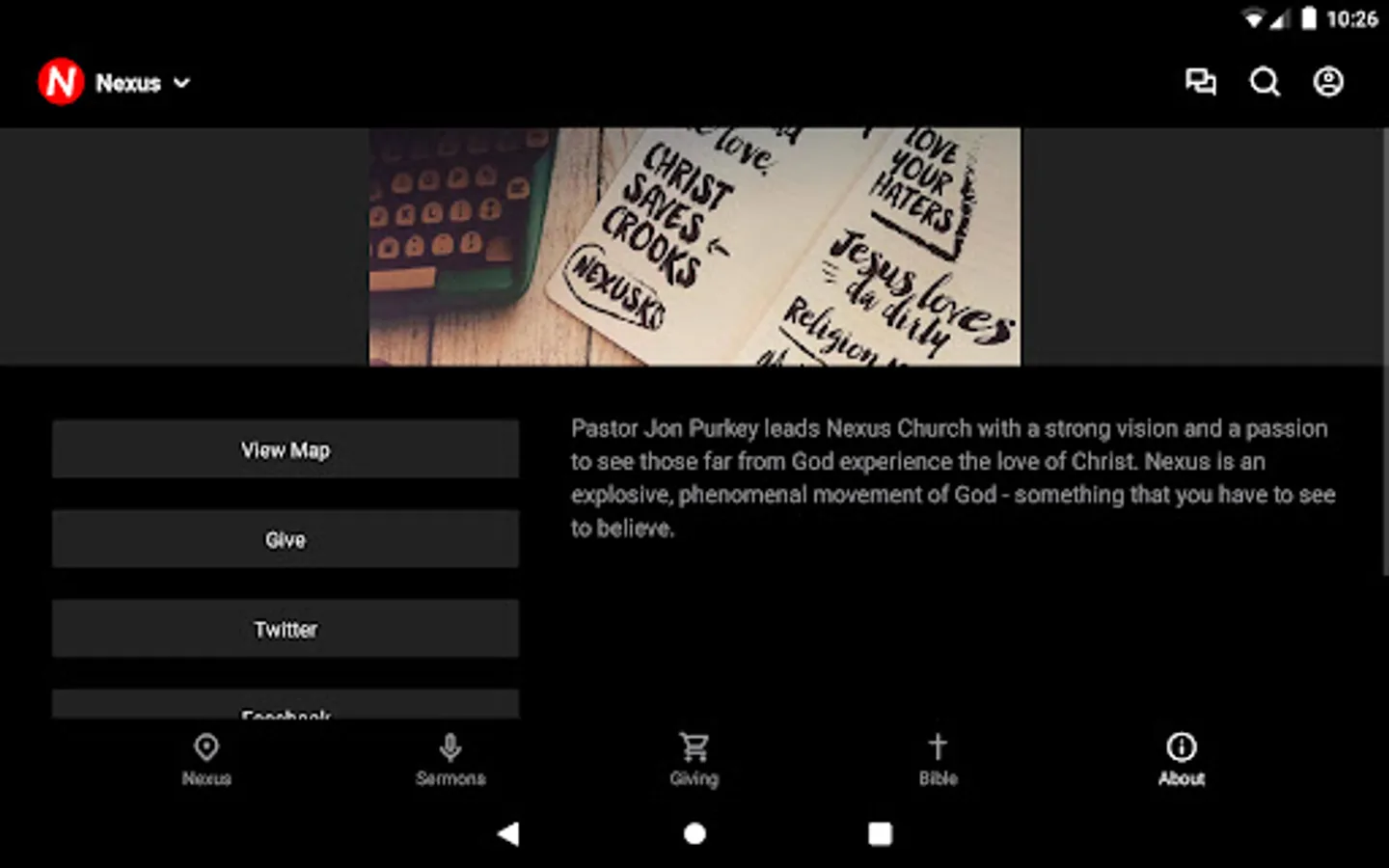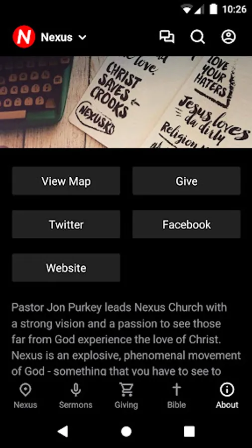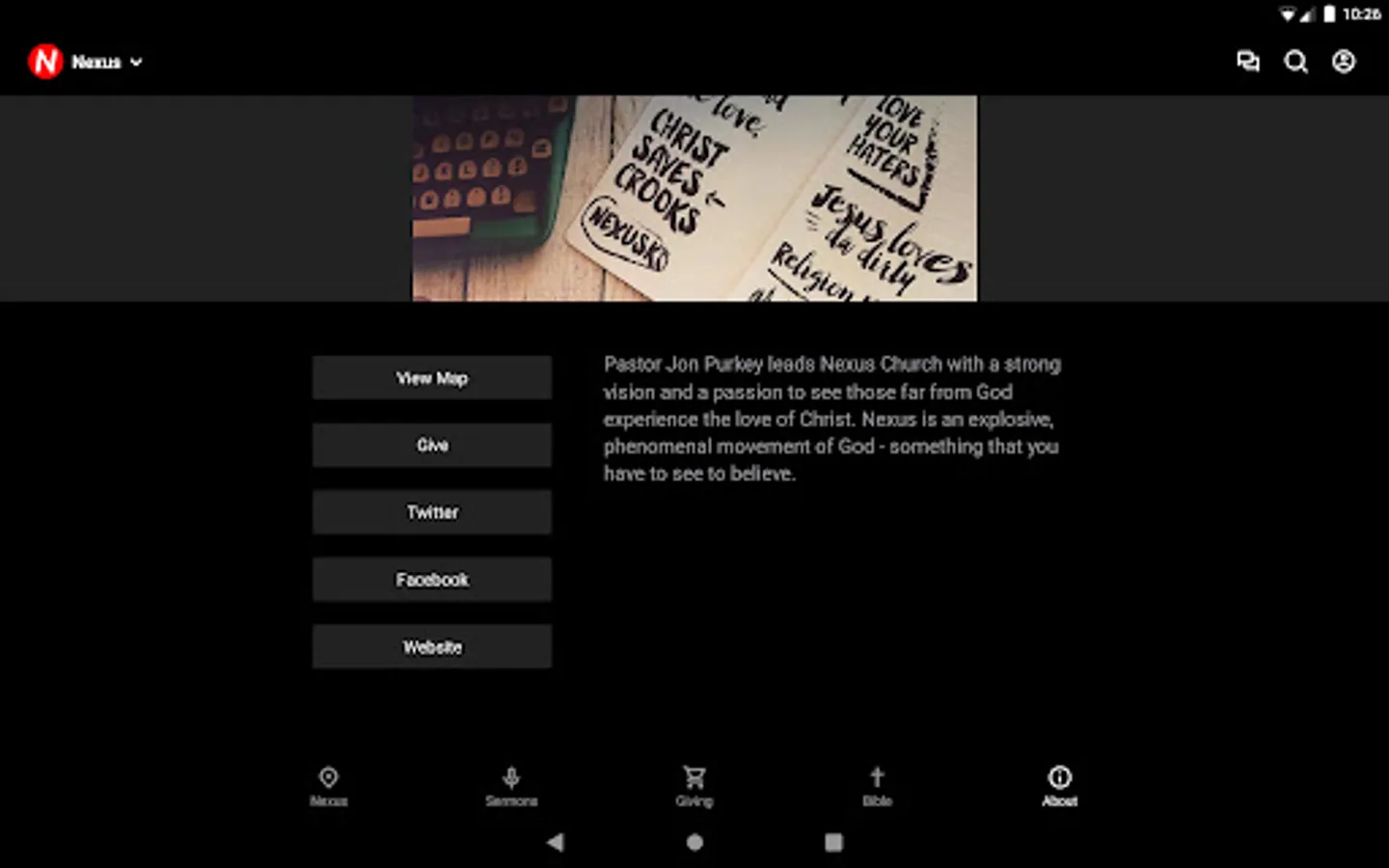 Welcome to the official Nexus Church app. Nexus Church is all about spreading the love of Christ to a lost and dying world. The Nexus Church app features powerful content from Pastor Jon Purkey, who leads Nexus Church in Lenexa, Kansas.