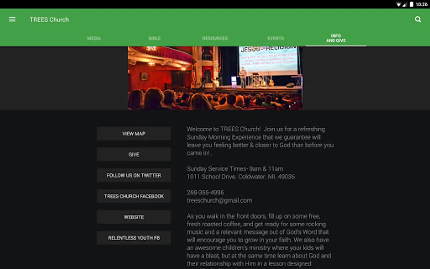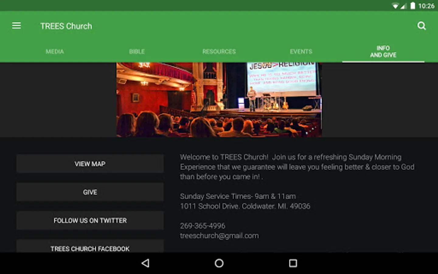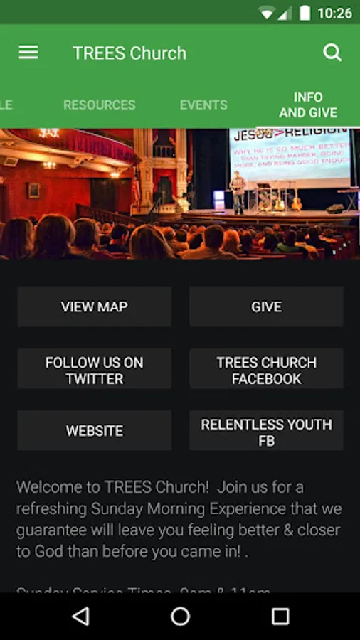 Welcome to TREES Church! Feel free to take a virtual "Tour" of our church by exploring our App. Watch some videos, check out our links, and feel free to contact us with any questions . We would LOVE for you to join us for a refreshing Sunday Morning Experience that we guarantee will leave you feeling spiritually re-charged & closer to God than before you came in! .