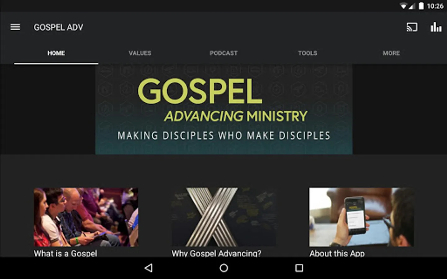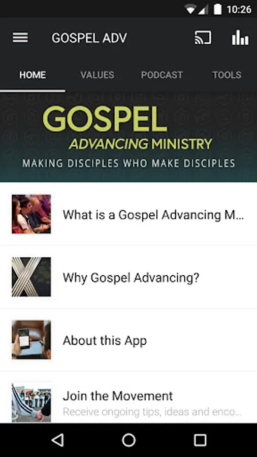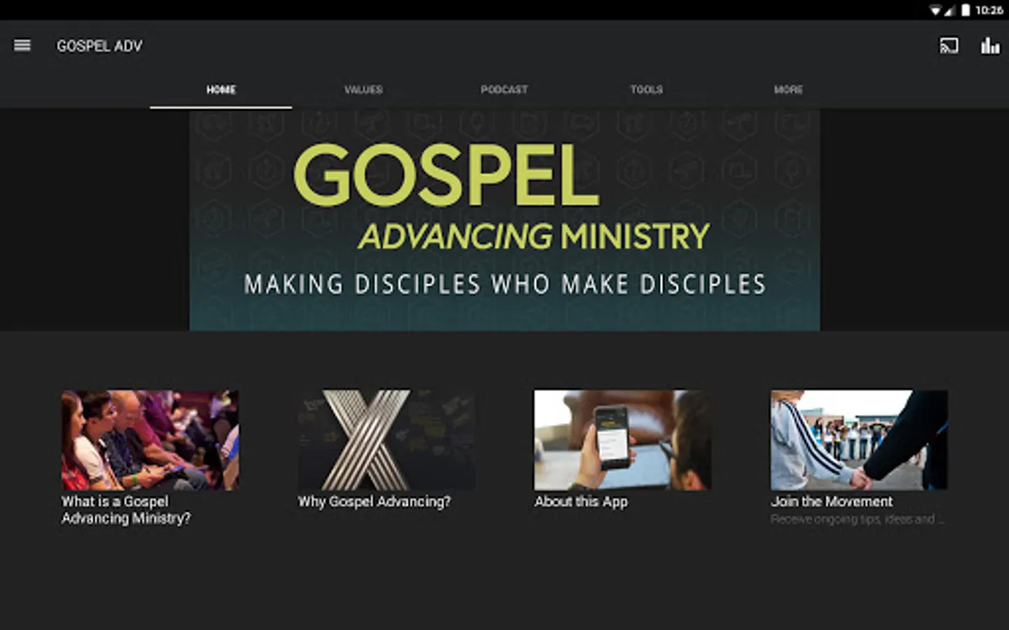 The Gospel Advancing Ministry App was created with the Subsplash App Platform.