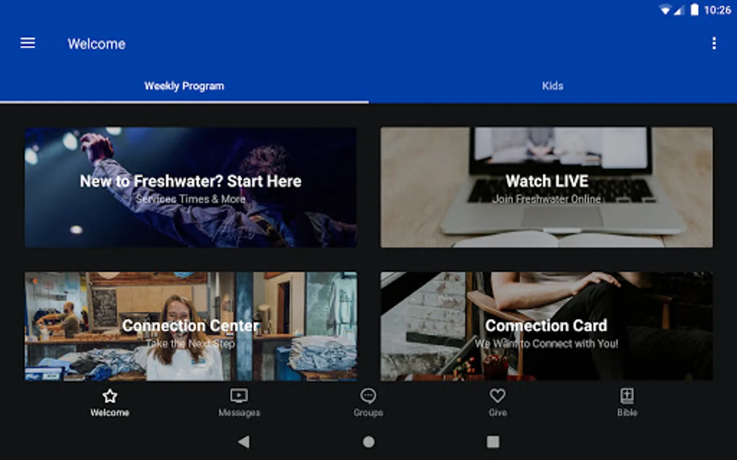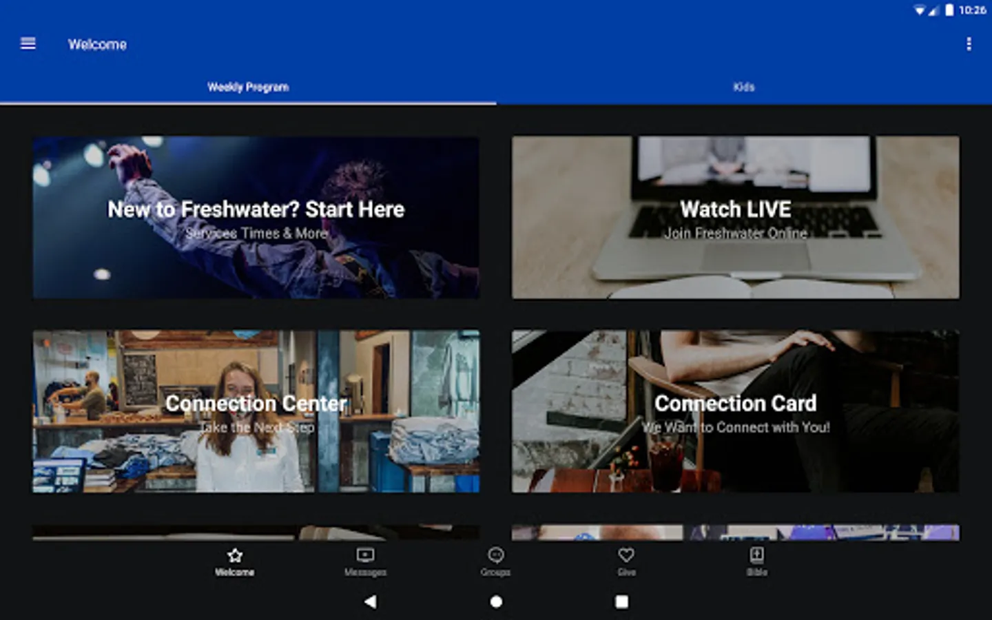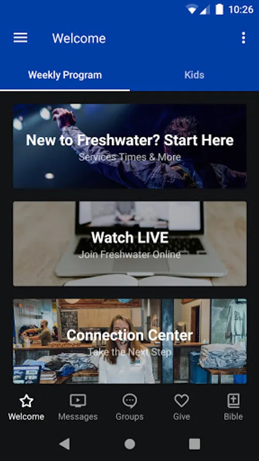 The Freshwater Church app was developed with the Subsplash App Platform.
