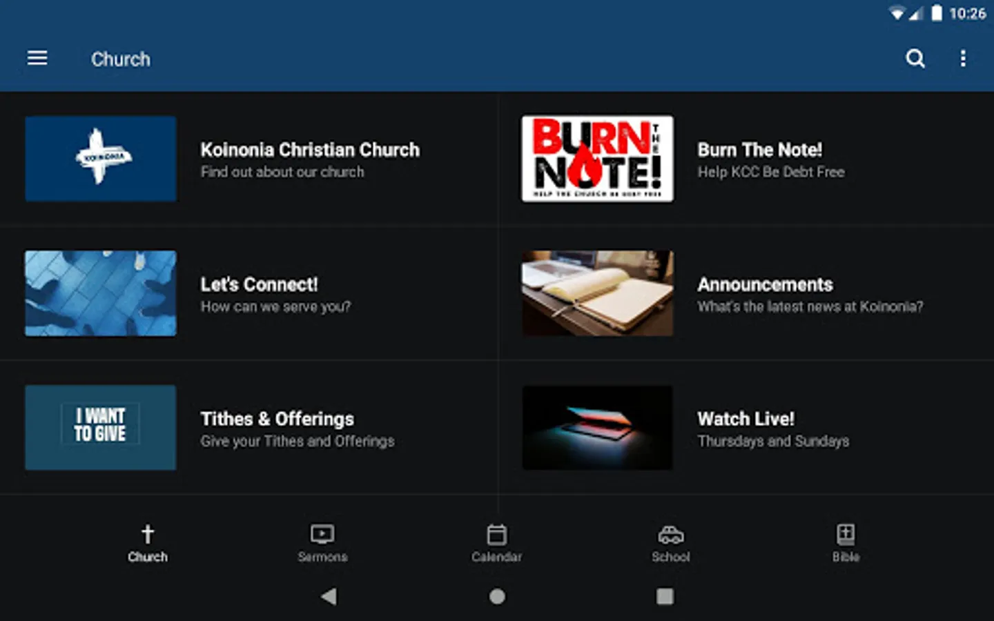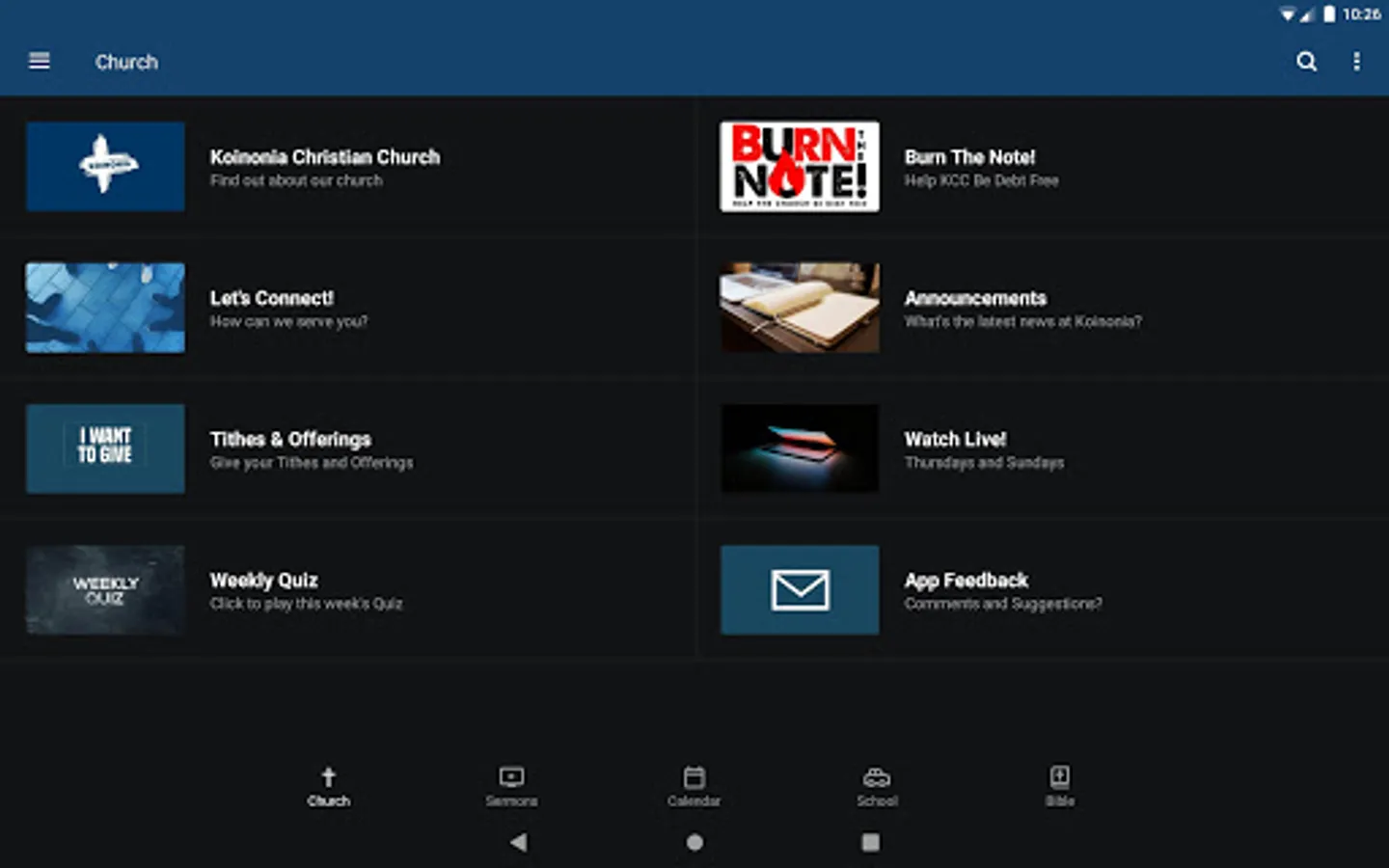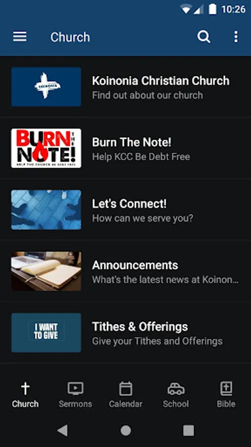 The Koinonia Christian Church app was developed with the Subsplash App Platform.