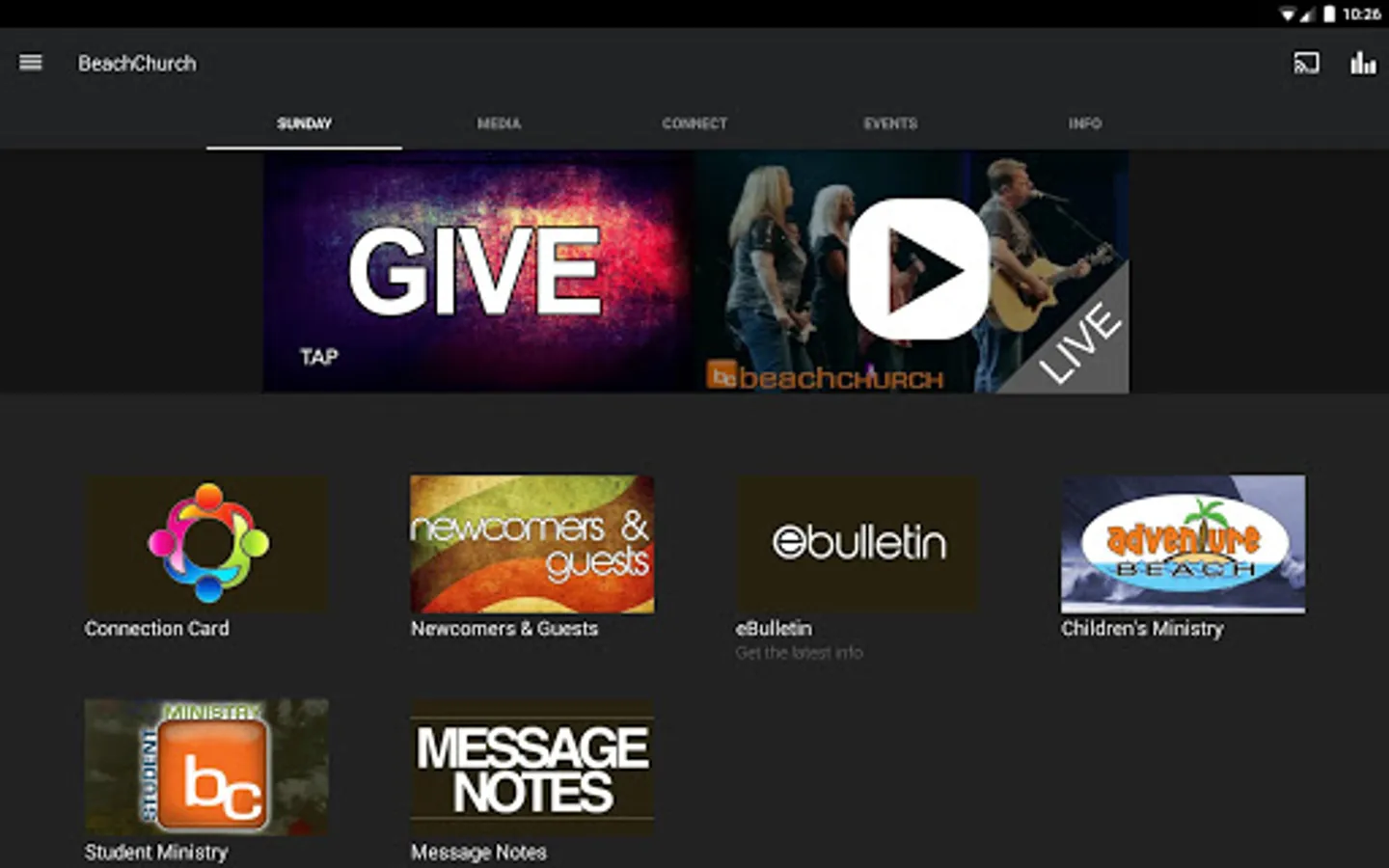Welcome to the Beach Church app. Check out all kinds of content that interests you. After you've downloaded and enjoyed the content, you can share it with your friends via Twitter, Facebook, or email.