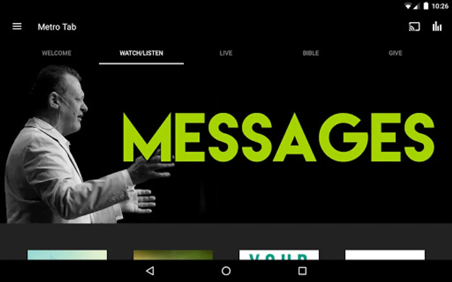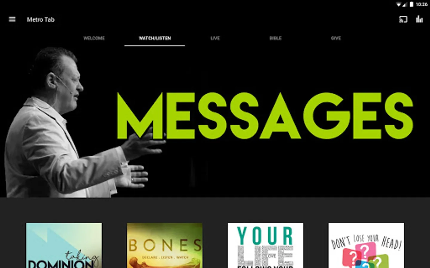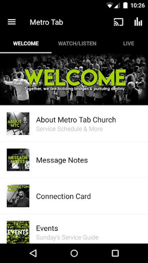 Explore the wide range of resources from connection cards and message notes to video/audio messages and life groups. The Metro Tab Church App is a great way to connect and start the Metro Tab journey. We are better together!