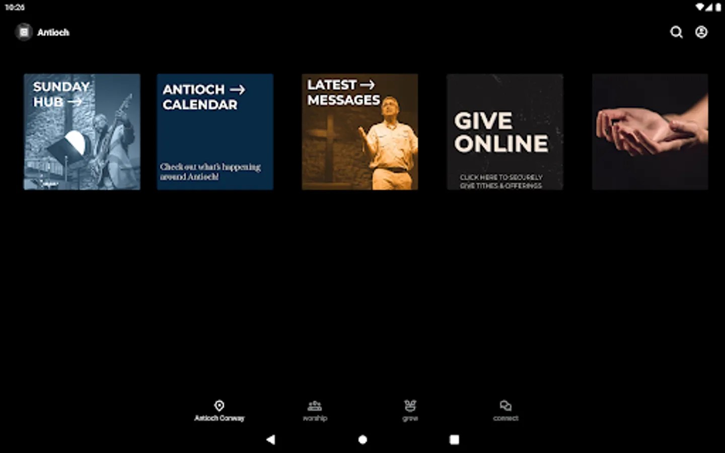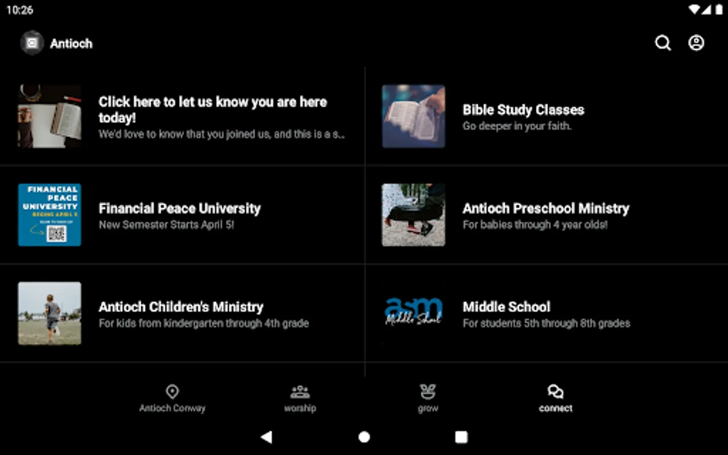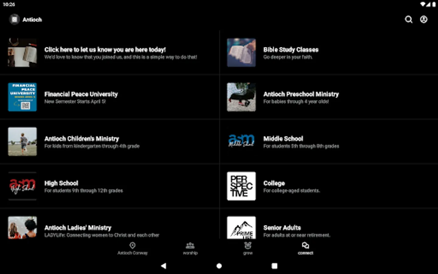 Whether you're a long-time member or thinking about giving Antioch a try, this app will connect you to what is going on and help you see what Antioch is all about. We've divided the app into five easy-to-use tabs: