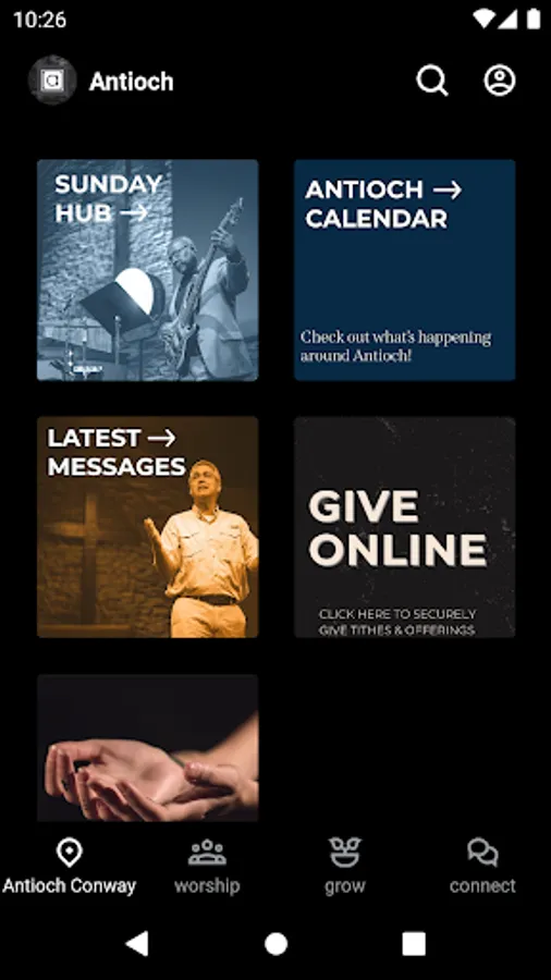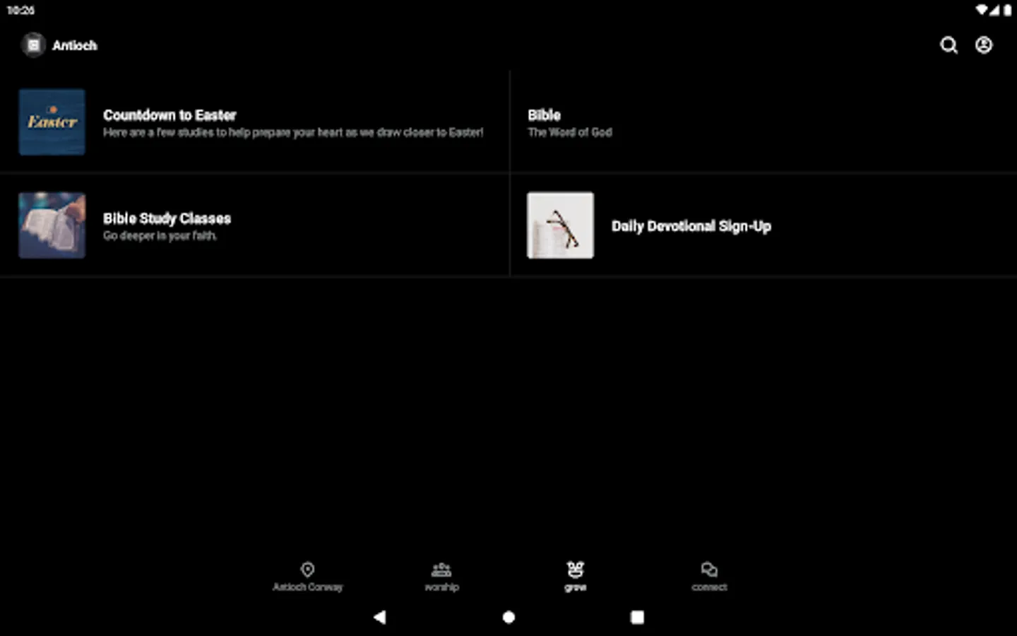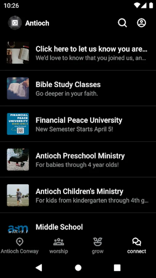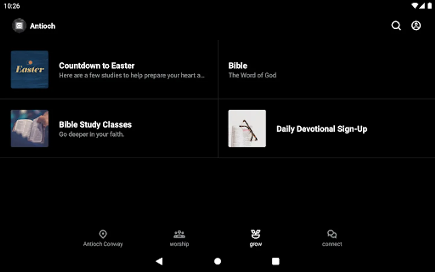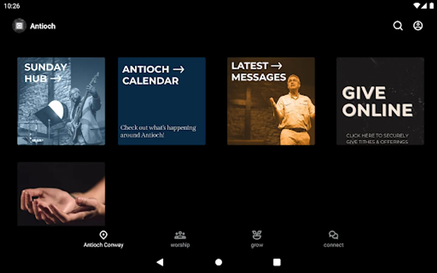 Whether you're a long-time member or thinking about giving Antioch a try, this app will connect you to what is going on and help you see what Antioch is all about. We've divided the app into five easy-to-use tabs: