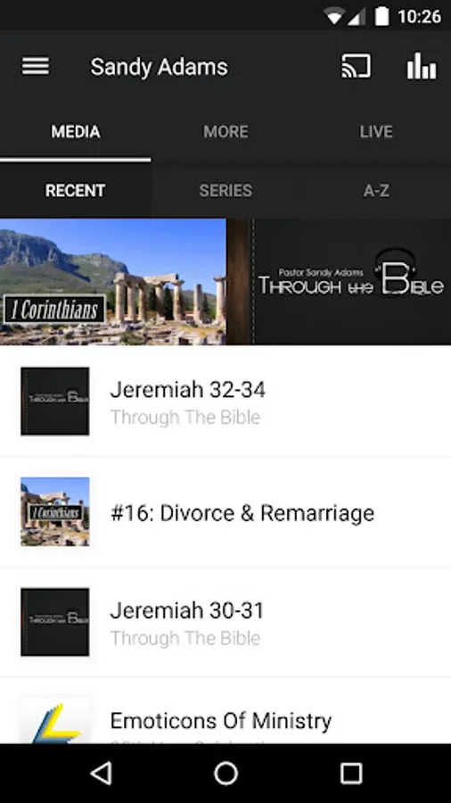 The Sandy Adams app was developed with the Subsplash App Platform.