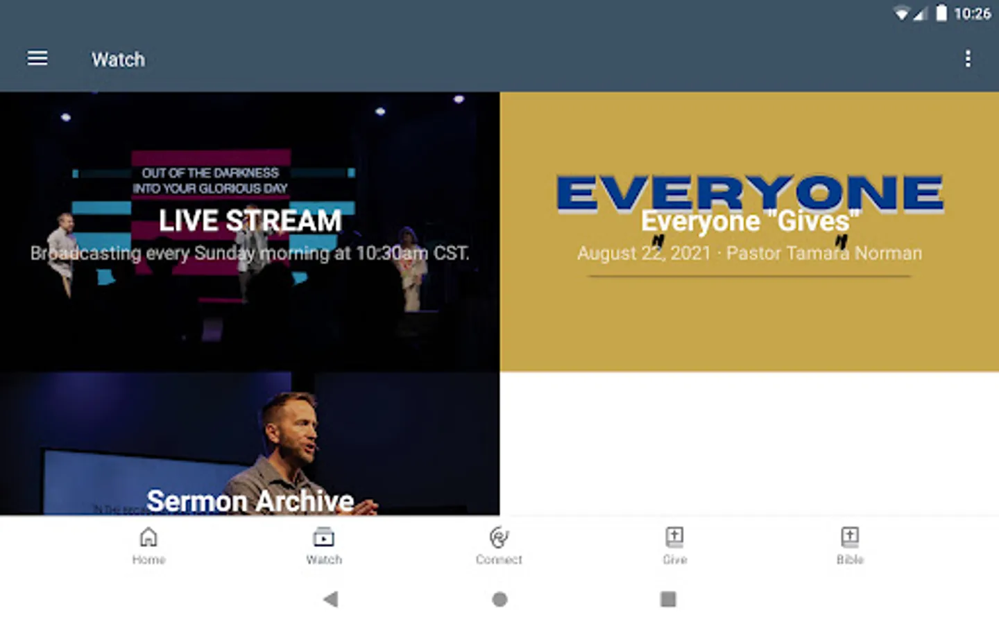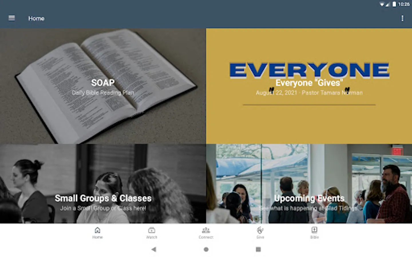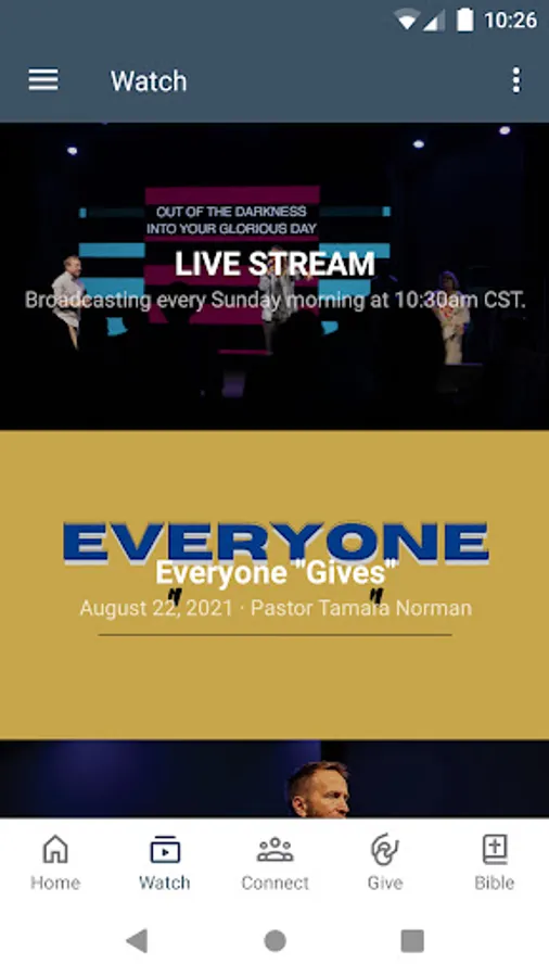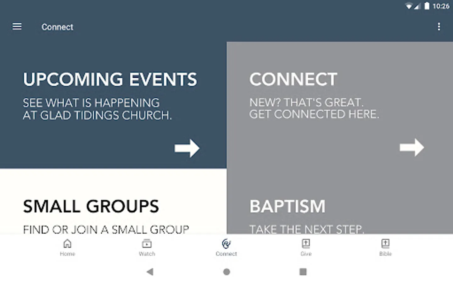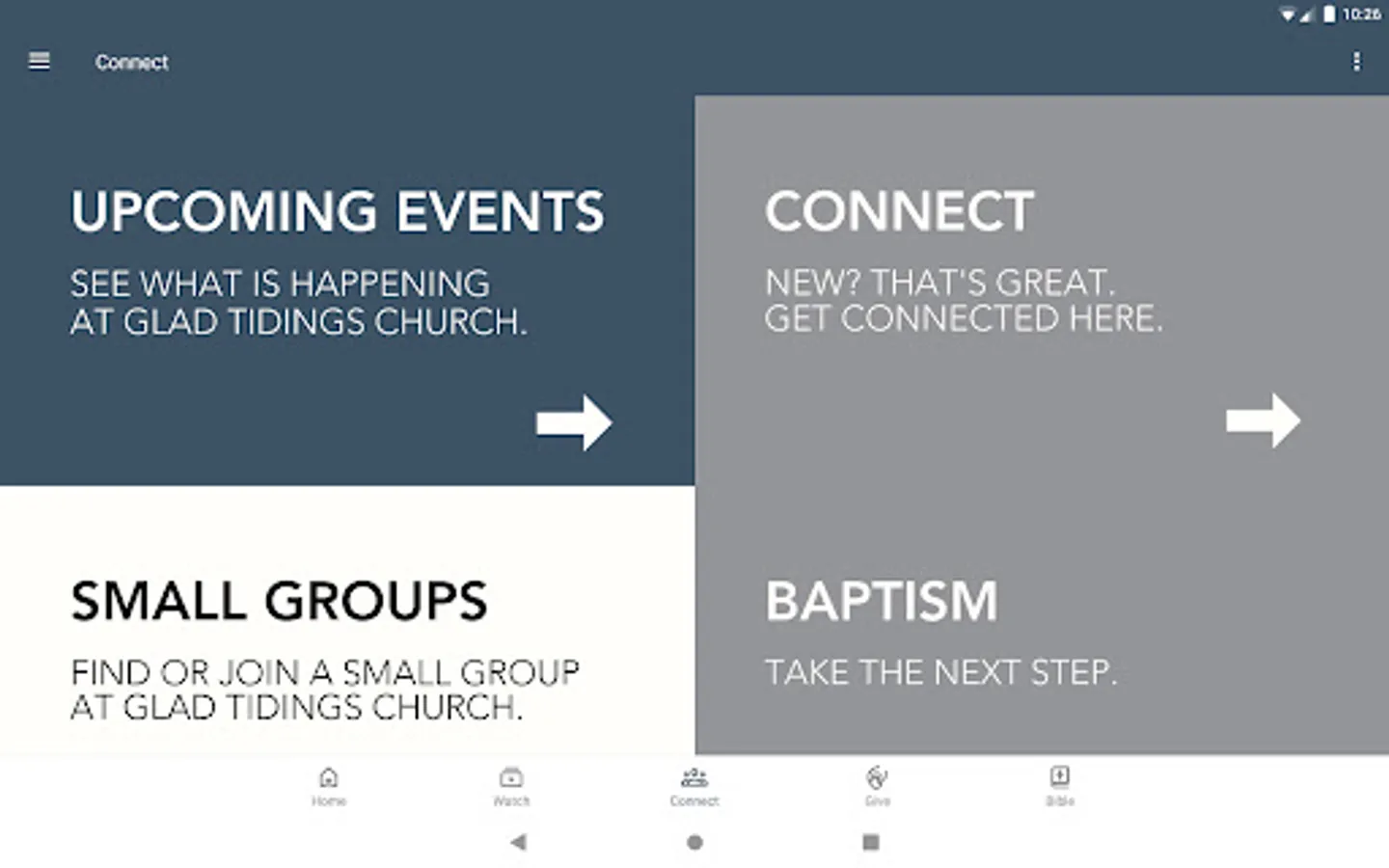 This app will help you stay connected with the day-to-day life of Glad Tidings Church. With this app you can: watch or listen to past messages; stay up to date with future events, receive push notifications; share your favorite messages via Facebook, or email; and download messages for offline listening.