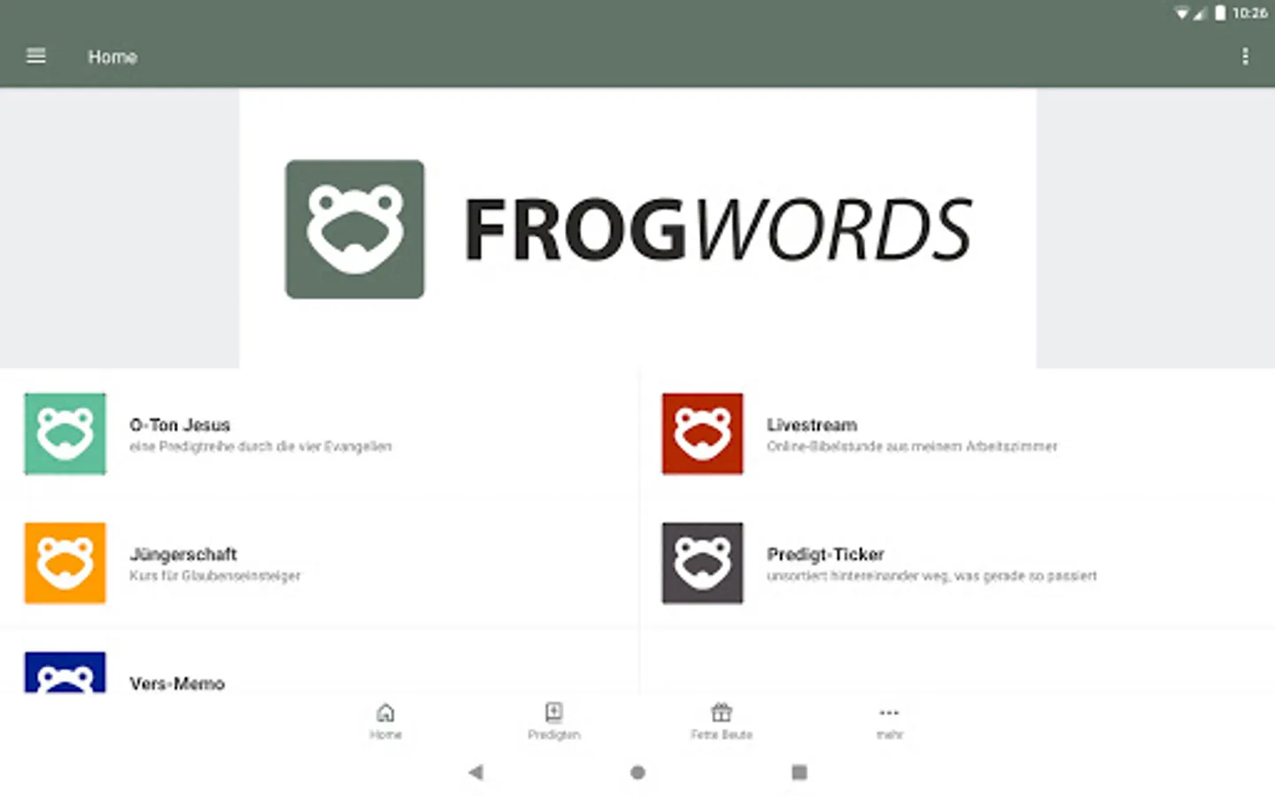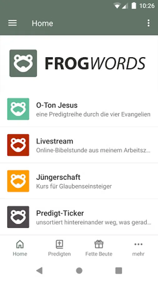The FROGWORDS App helps you grow in your relationship with Jesus Christ. Your App from Jürgen Fischer delivers you daily devotionals, sermons, message notes, discipleship-course, access to frogwords.de, and more. Please share with your friends. All messages are given in German!